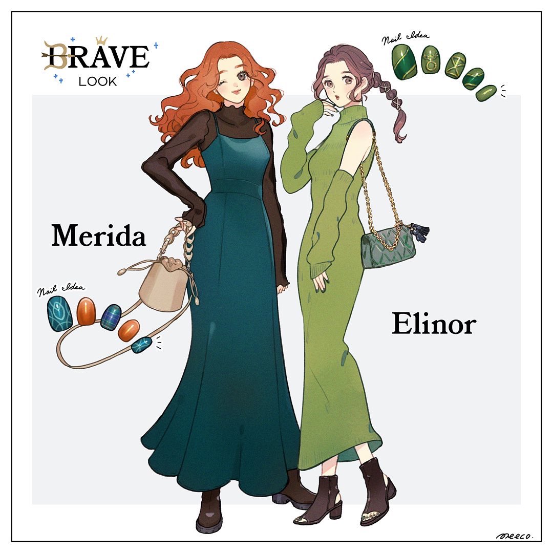 2girls animification brave_(pixar) brown_hair contemporary copyright_name dress elinor_(brave) genderswap jewelry long_hair long_sleeves looking_at_viewer meecosme merida_(brave) mother_and_child mother_and_daughter multiple_girls nail_polish parent_and_child ponytail simple_background smile