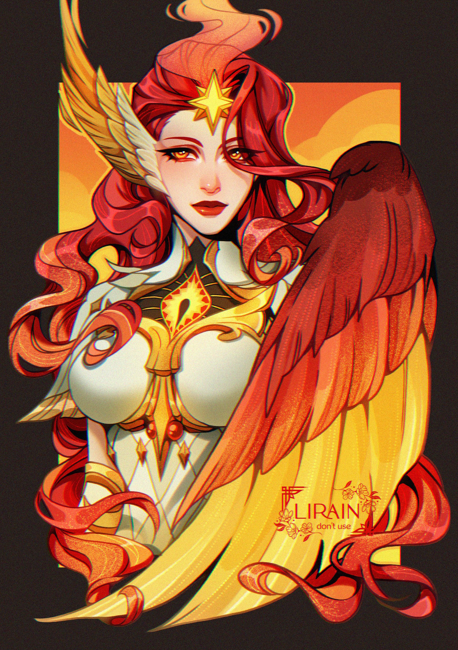 1girl absurdres afk_(series) afk_journey artist_name closed_mouth cropped_torso dress feather_hair_ornament feathered_wings feathers floating_hair framed_breasts gradient_background hair_ornament highres jewelry lipstick lirain long_hair looking_to_the_side makeup orange_background orange_eyes outside_border red_hair red_lips red_wings solo straight-on talene_(afk) upper_body white_dress wings
