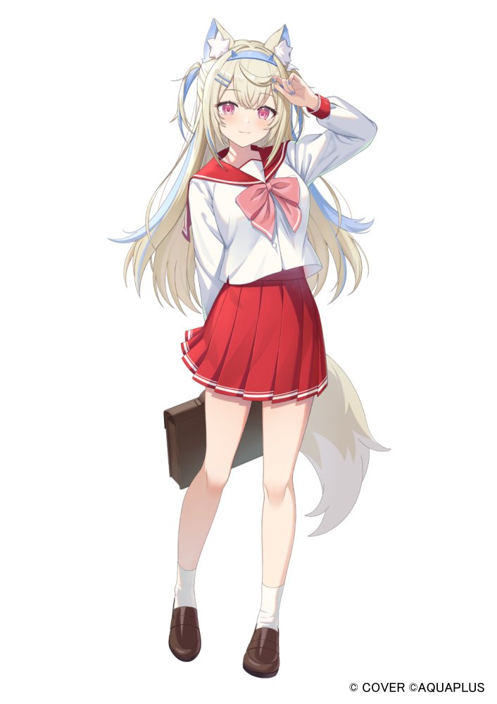 1girl animal_ear_fluff animal_ears arm_behind_back arm_up bag bandaid bandaid_hair_ornament blonde_hair blue_hair blue_hairband bow bowtie brown_shoes closed_mouth commentary copyright_notice crossed_bangs dog_ears dog_girl dog_tail double-parted_bangs english_commentary fake_horns full_body fuwawa_abyssgard hair_between_eyes hair_ornament hairband hairclip holding holding_bag hololive hololive_english horn_hairband loafers long_hair long_sleeves looking_at_viewer miniskirt multicolored_hair official_art open_mouth pink_bow pink_bowtie pink_eyes pleated_skirt red_sailor_collar red_skirt sailor_collar school_uniform serafuku shirt shoes simple_background skirt smile socks solo standing streaked_hair tail to_heart to_heart_(series) tokisaka_makoto two_side_up virtual_youtuber white_background white_shirt white_socks