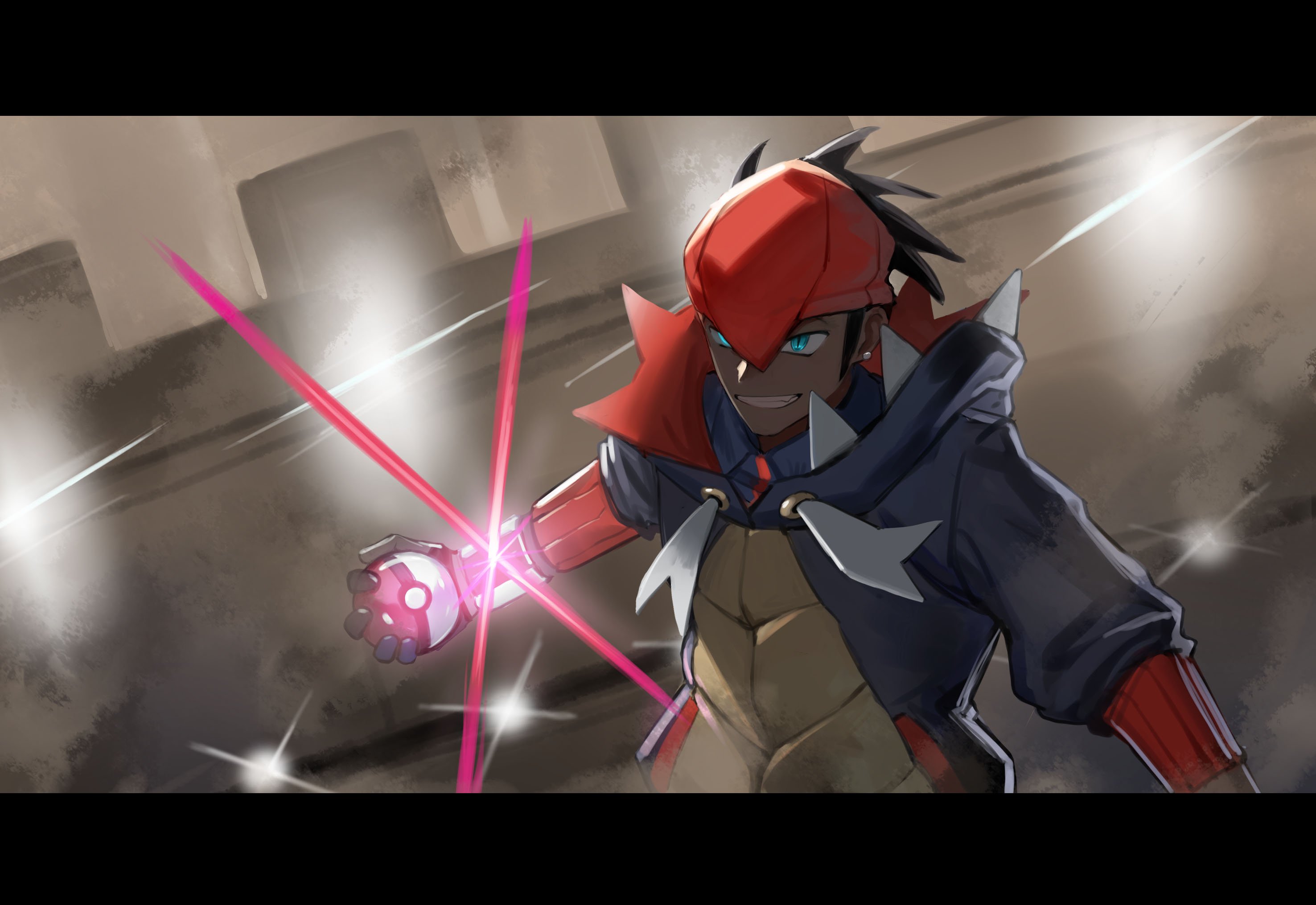 1boy black_jacket blue_eyes dark-skinned_male dark_skin drawstring grin hat highres holding holding_poke_ball hood hood_down jacket jiuri_jiuhao letterboxed long_sideburns male_focus nintendo poke_ball pokemon pokemon_sword_and_shield raihan_(pokemon) sideburns slit_pupils smile solo