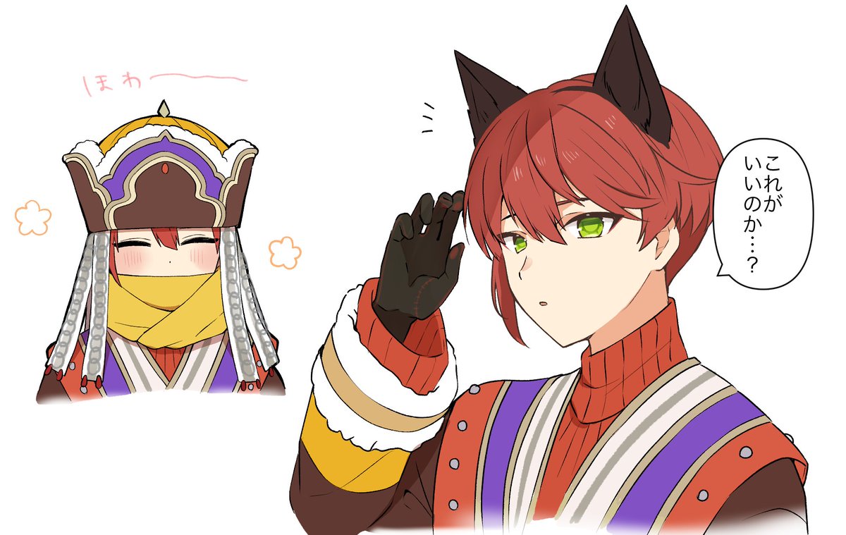 1boy ^_^ animal_ears black_gloves blush cat_ears closed_eyes commentary_request cropped_torso cuilang_(rune_factory) eco_(comochz) gloves green_eyes hair_between_eyes hand_up hat long_sleeves looking_at_viewer male_focus multiple_views red_hair red_sweater rune_factory rune_factory:_guardians_of_azuma scarf short_hair simple_background speech_bubble sweater translation_request upper_body white_background yellow_scarf