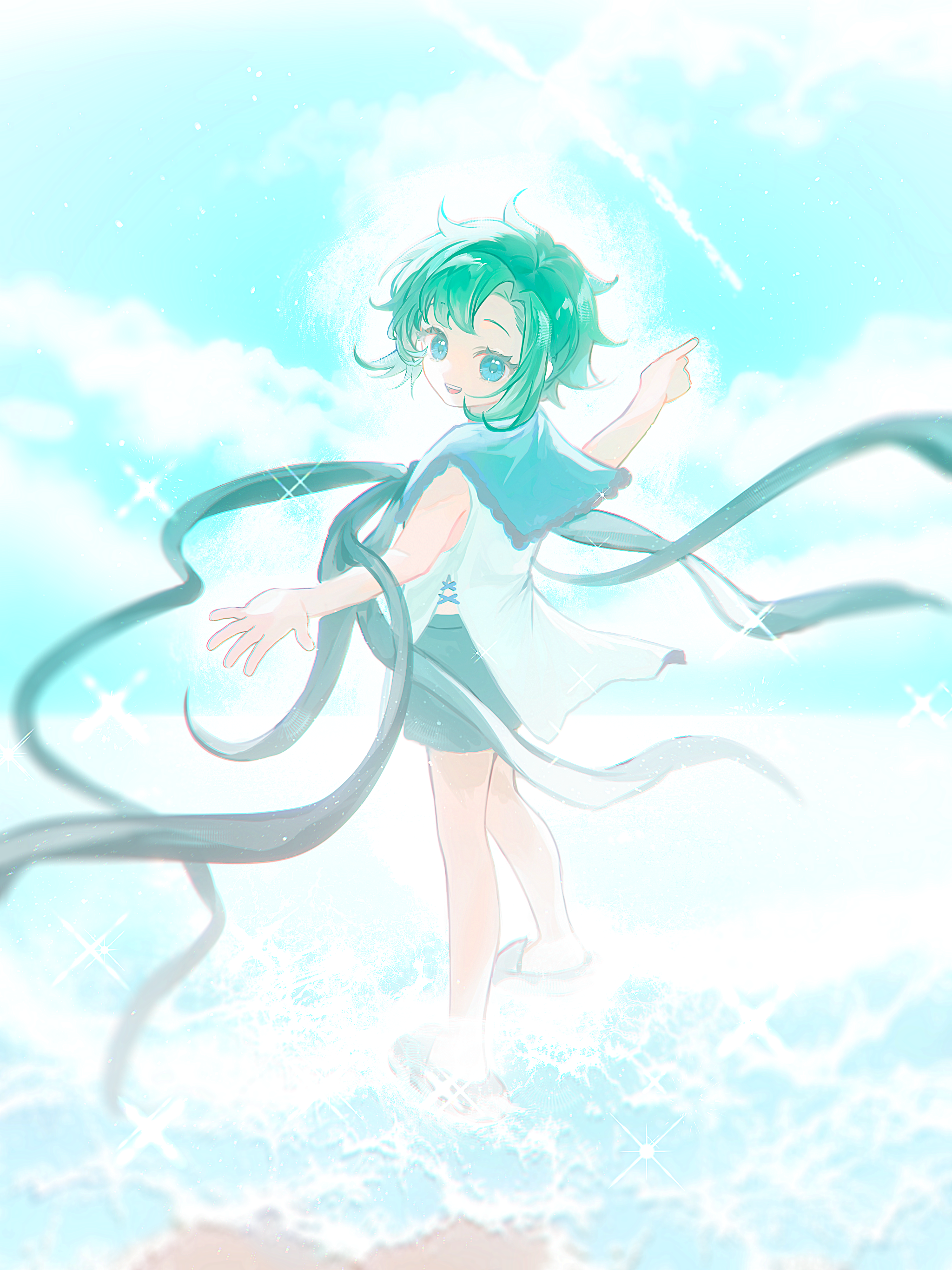 1boy :d absurdres bare_arms bare_legs bare_shoulders beach bloom blue_eyes blue_sailor_collar blue_sky child chinese_commentary cloud commentary_request cross-laced_clothes cross-laced_top curtained_hair day frilled_sailor_collar frills from_behind full_body green_hair green_shorts grey_slippers highres light_particles looking_at_viewer looking_back male_focus open_mouth personification plants_vs._zombies pointing pointing_forward reaching reaching_towards_viewer rrtion sailor_collar sea-shroom_(plants_vs._zombies) shirt short_hair shorts sky sleeveless sleeveless_shirt slippers smile solo sparkle standing teeth upper_teeth_only wading water white_shirt