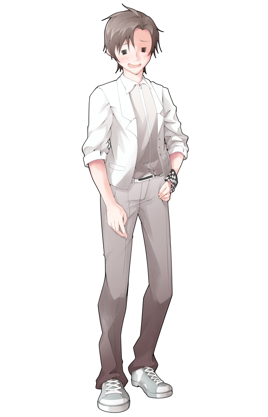 1boy =_= arm_at_side blazer blush brown_hair cevio checkered_bracelet collared_shirt commentary_request converse dairi facing_viewer full_body grey_pants grey_shoes hand_on_own_hip highres jacket large_variant_set male_focus open_mouth pants shirt shoes short_hair sleeves_rolled_up smile sneakers solo standing tachi-e takahashi_amato transparent_background variant_set white_jacket white_shirt wing_collar