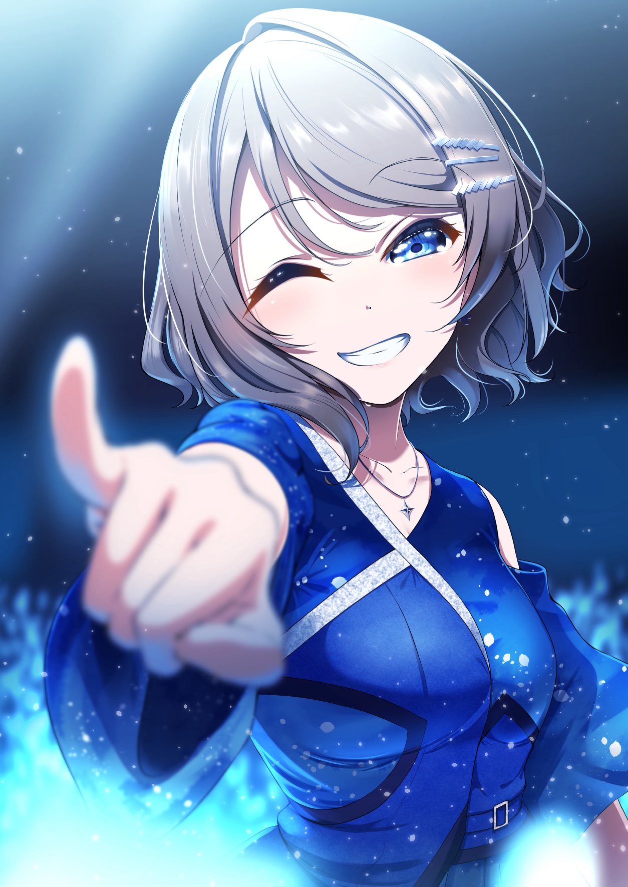 1girl amaki-chan_(volfuji) aqours_finale_lovelive!_~eikyuu_stage~ belt_buckle blue_background blue_eyes blush breasts brown_hair buckle clenched_hand dark_background dot_nose dress earrings gem glitter grey_hair hair_ornament hairclip hand_up head_tilt highres idol idol_clothes jewelry light_particles looking_at_viewer loose_clothes loose_dress love_live! love_live!_sunshine!! necklace one_eye_closed pointing raised_fist short_hair silver_necklace silver_trim simple_background single_bare_shoulder single_earring skirt smile solo star_(symbol) teeth upper_body watanabe_you wavy_hair