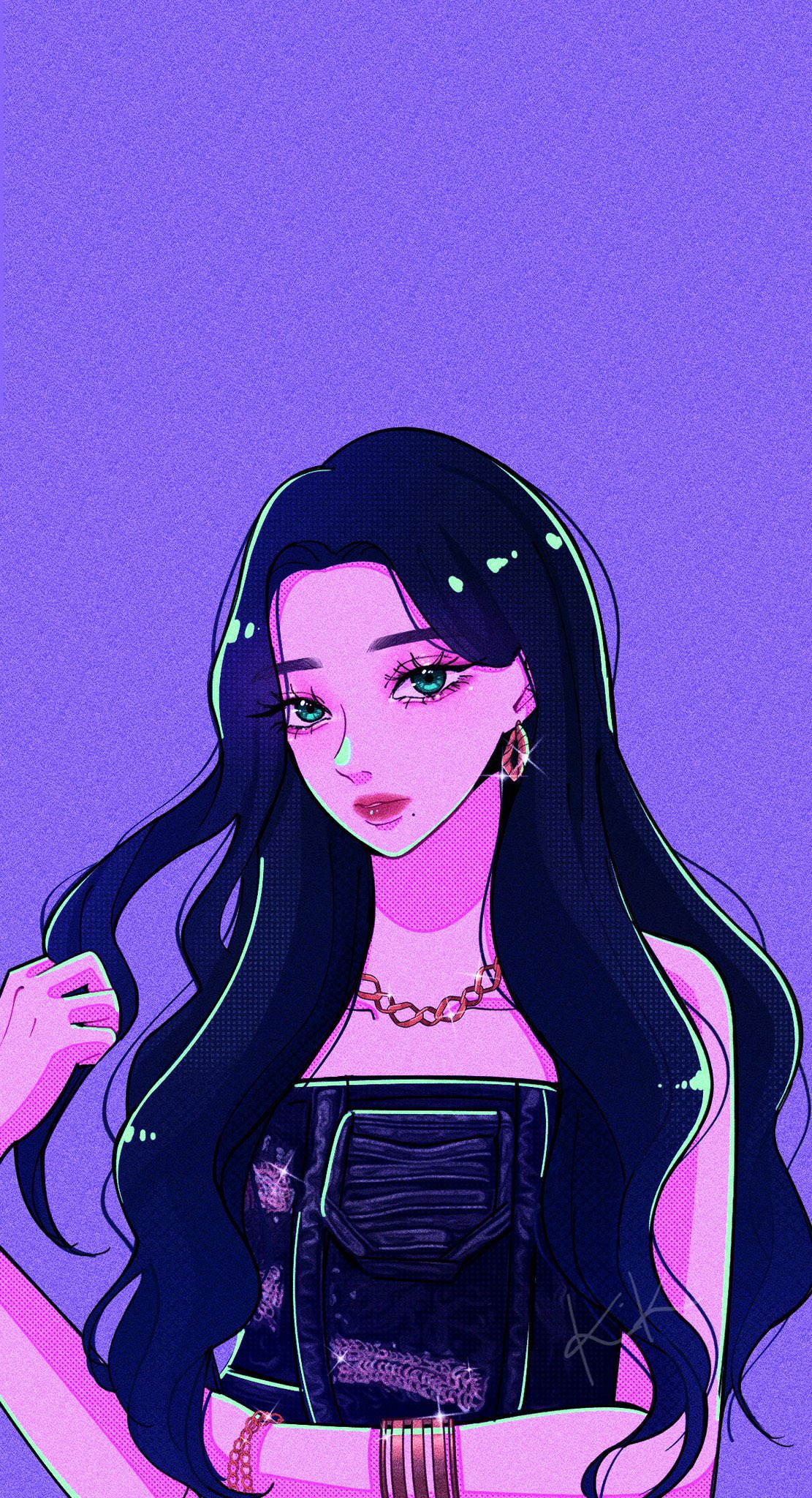 1girl aespa black_hair blue_eyes bracelet commentary_request earrings eyeshadow glint highres jewelry k-pop karina_(aespa) long_hair makeup mascara mixed-language_commentary mole necklace purple_background real_life sail_ofhope simple_background solo upper_body