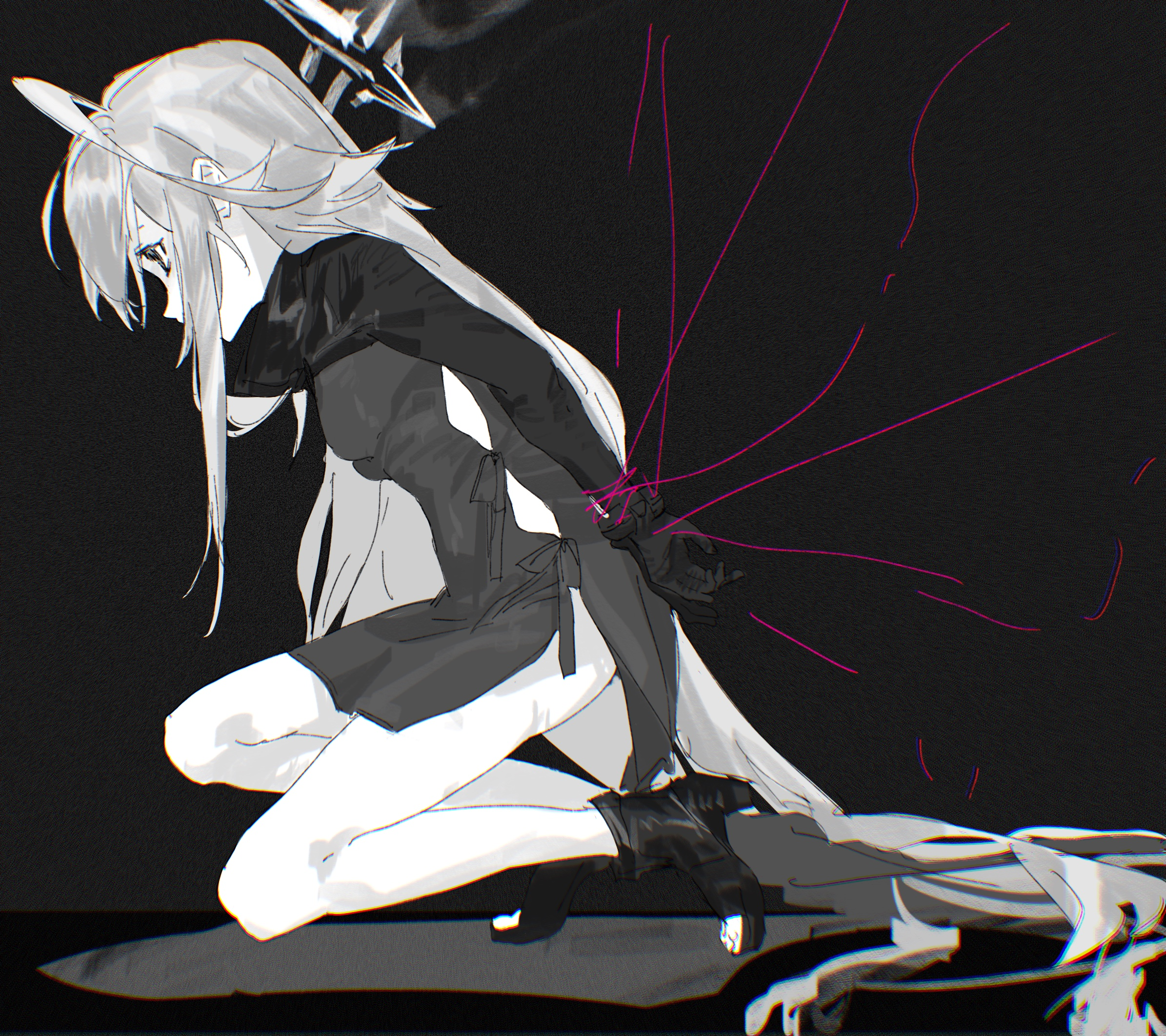 1girl ahoge black_background blue_archive bound bound_wrists dress from_side gloves greyscale halo high_collar high_heels highres hoshino_(blue_archive) long_hair monochrome open-toe_shoes shoes short_dress shrug_(clothing) side_slit solo spot_color squatting thread yu-y_(824412)