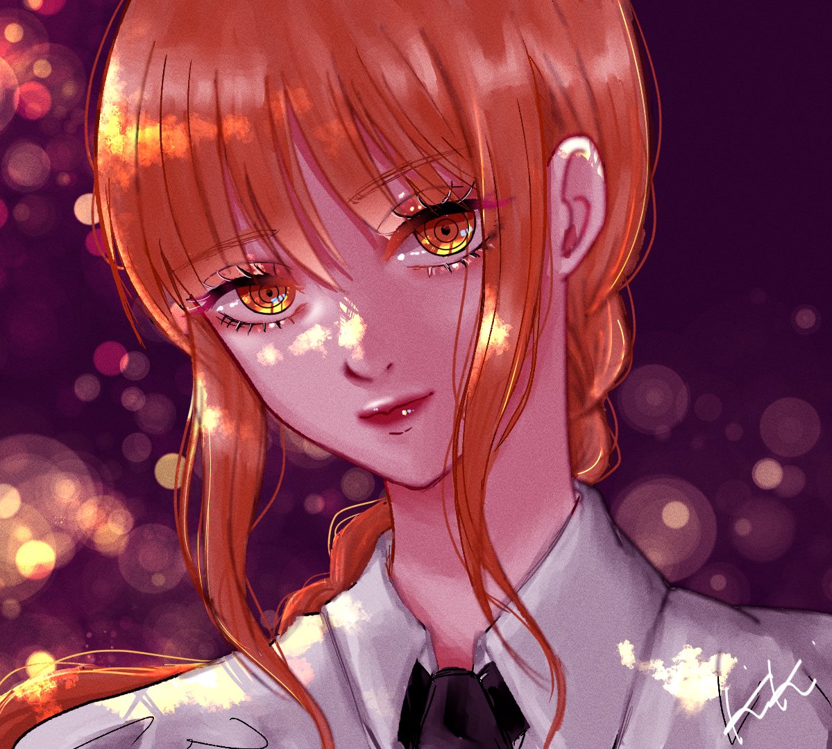 1girl black_necktie blunt_bangs braid braided_ponytail chainsaw_man collared_shirt commentary_request eyelashes hair_between_eyes light_smile makima_(chainsaw_man) necktie orange_hair purple_background red_lips ringed_eyes sail_ofhope shirt sidelocks signature solo upper_body white_shirt