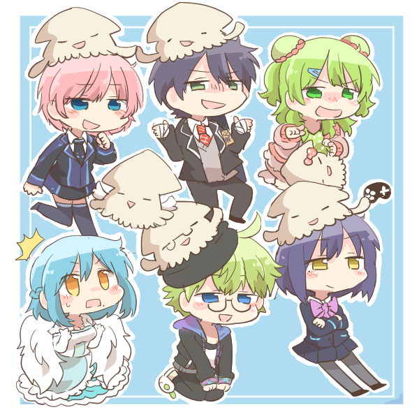 2boys 4girls :d bandaged_hand bandages black_jacket black_pants blazer blue_background blue_eyes blue_hair blue_skirt bow brown_eyes camisole chibi double_bun elbow_gloves gloves green_camisole green_eyes green_hair grey_pantyhose grey_sweater hair_bun hood hood_down hooded_jacket jacket kenmochi_touya kenmochi_touya_(1st_costume) moira_(1st_costume)_(nijisanji) moira_(nijisanji) morinaka_kazaki morinaka_kazaki_(2nd_costume) multiple_boys multiple_girls nijisanji open_clothes open_jacket open_mouth outline pants pantyhose pink_hair pink_jacket pink_shorts polka_dot_camisole puffy_short_sleeves puffy_sleeves purple_bow purple_hair rebecca_(keinelove) school_uniform shibuya_hajime shibuya_hajime_(1st_costume) shirt shizuka_rin shizuka_rin_(1st_costume) short_sleeves shorts skirt slippers smile sweater virtual_youtuber white_gloves white_outline white_shirt white_slippers yuuhi_riri yuuhi_riri_(1st_costume)
