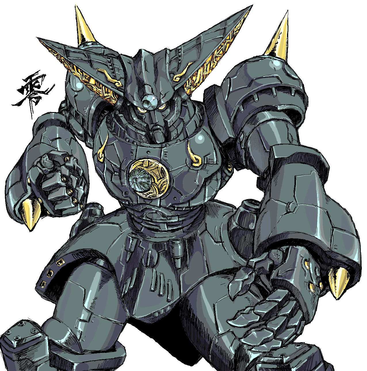 clenched_hand coso-ri fighting_stance highres looking_at_viewer mikazuki_zero sanding tekkouki_mikazuki tokusatsu white_background yellow_eyes
