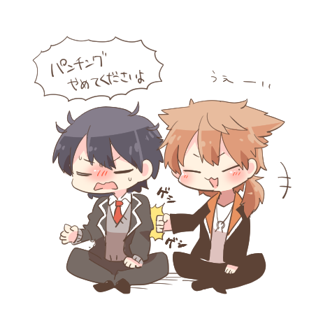 +++ 2boys :d black_hair black_jacket black_pants black_shoes blazer blush_stickers brown_hair chibi closed_eyes collared_shirt commentary_request fushimi_gaku fushimi_gaku_(1st_costume) grey_sweater jacket kenmochi_touya kenmochi_touya_(1st_costume) long_hair low_ponytail lowres male_focus mole mole_under_eye multiple_boys necktie nijisanji open_clothes open_jacket open_mouth pants ponytail punching rebecca_(keinelove) red_necktie school_uniform shirt shoes simple_background sitting smile sweater translation_request v-shaped_eyebrows virtual_youtuber wavy_mouth white_background white_shirt
