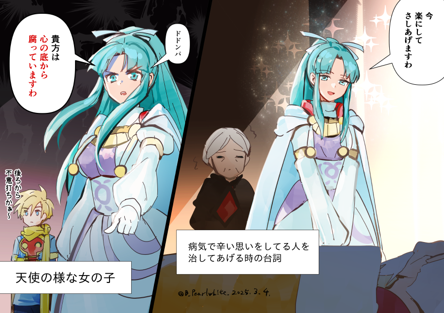 1boy 2girls aqua_hair blonde_hair blue_eyes breasts cape closed_mouth gloves golden_sun hair_ribbon isaac_(golden_sun) long_hair looking_at_viewer mia_(golden_sun) multiple_girls old old_woman open_mouth ponytail ribbon robe scarf shoochiku_bai smile sparkle white_gloves wide_ponytail