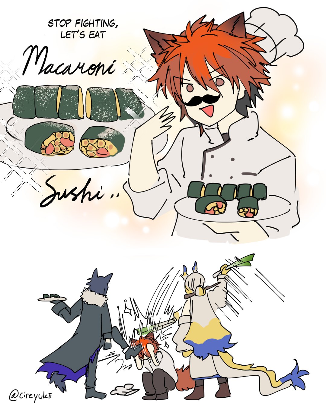 1girl 2boys animal_ears arknights beating black_hair blonde_hair blue_hair chiave_(arknights) crimes_against_food english_text fake_facial_hair fake_mustache food grey_hair highres holding holding_plate multicolored_hair multiple_boys open_mouth pasta plate red_hair short_hair shu_(arknights) spring_onion streaked_hair sushi tail vigil_(arknights) wolf_boy wolf_ears wolf_tail yukii