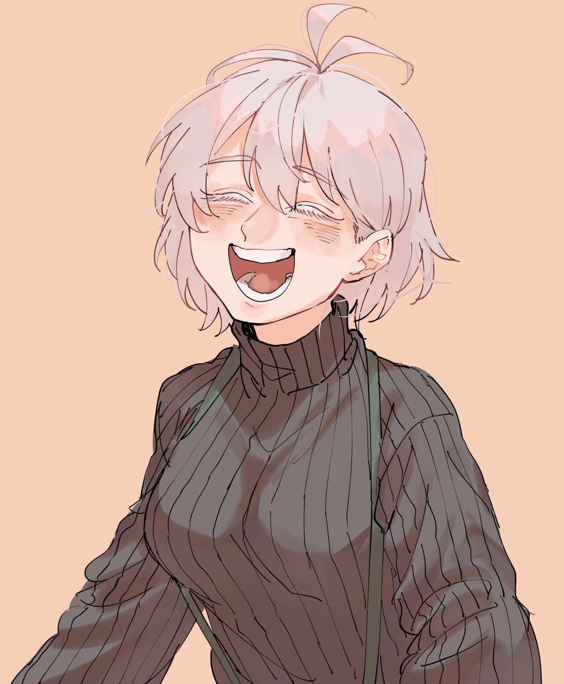 1girl :d ^_^ antenna_hair aohitsugi_nemu black_sweater blush breasts closed_eyes colored_eyelashes eyelashes hair_behind_ear hair_between_eyes happy highres hypnosis_mic long_sleeves medium_breasts open_mouth pink_background raised_eyebrows ribbed_sweater short_hair simple_background smile solo suspenders sweater teeth turtleneck upper_body urata_(kogasitata) white_hair