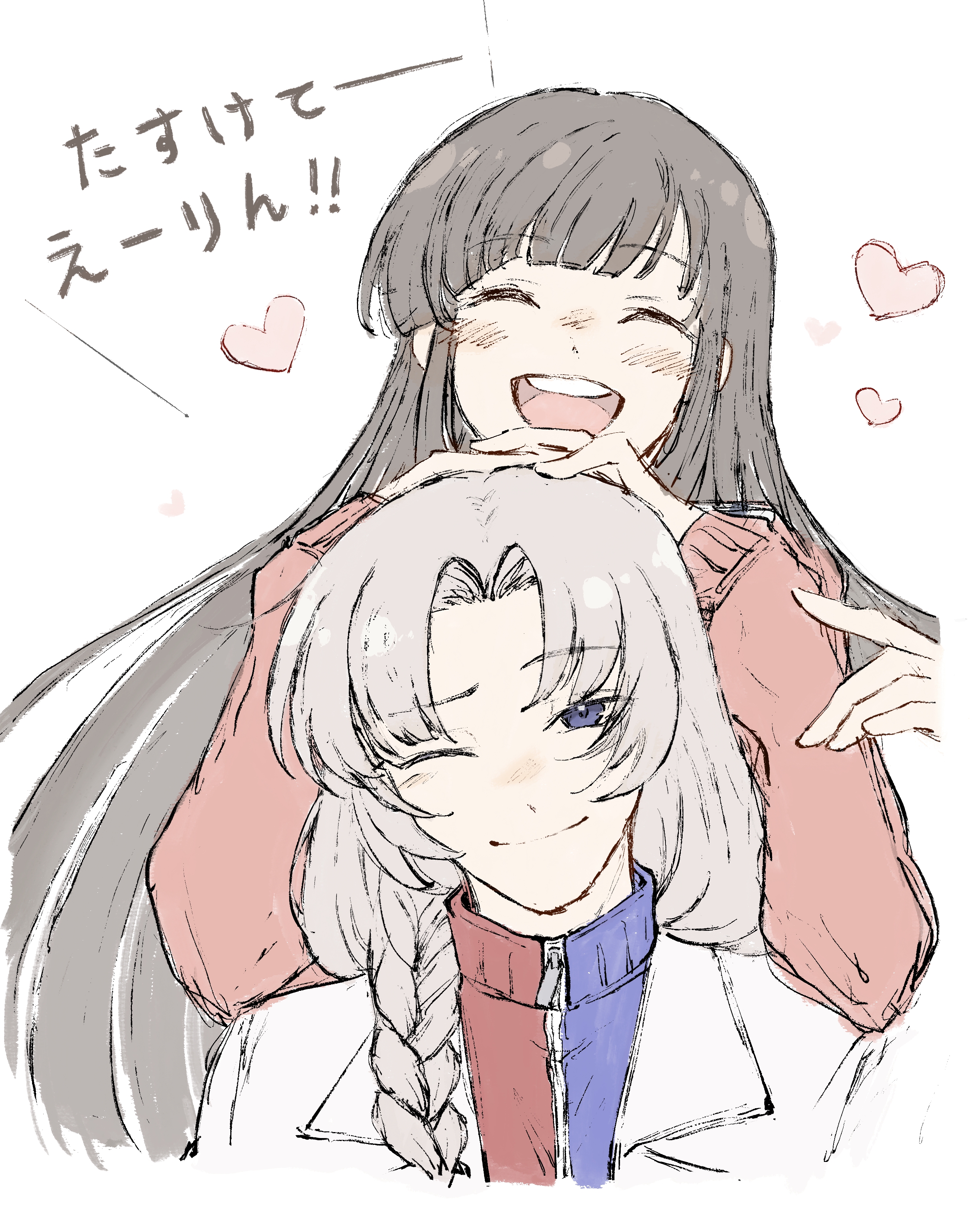 2girls ^_^ absurdres alternate_costume black_hair blue_eyes blue_jacket blunt_bangs blush braid braided_ponytail closed_eyes closed_mouth curtained_hair elbow_on_another's_shoulder elbow_rest grey_hair hair_over_shoulder hand_up hands_on_another's_head heart highres houraisan_kaguya jacket long_hair long_sleeves looking_at_viewer multicolored_jacket multiple_girls missing_headwear one_eye_closed open_mouth parted_bangs red_jacket school_uniform smile teeth touhou translation_request turtleneck turtleneck_jacket two-tone_jacket upper_teeth_only xinjinjumin6256801 yagokoro_eirin yuri zipper zipper_pull_tab