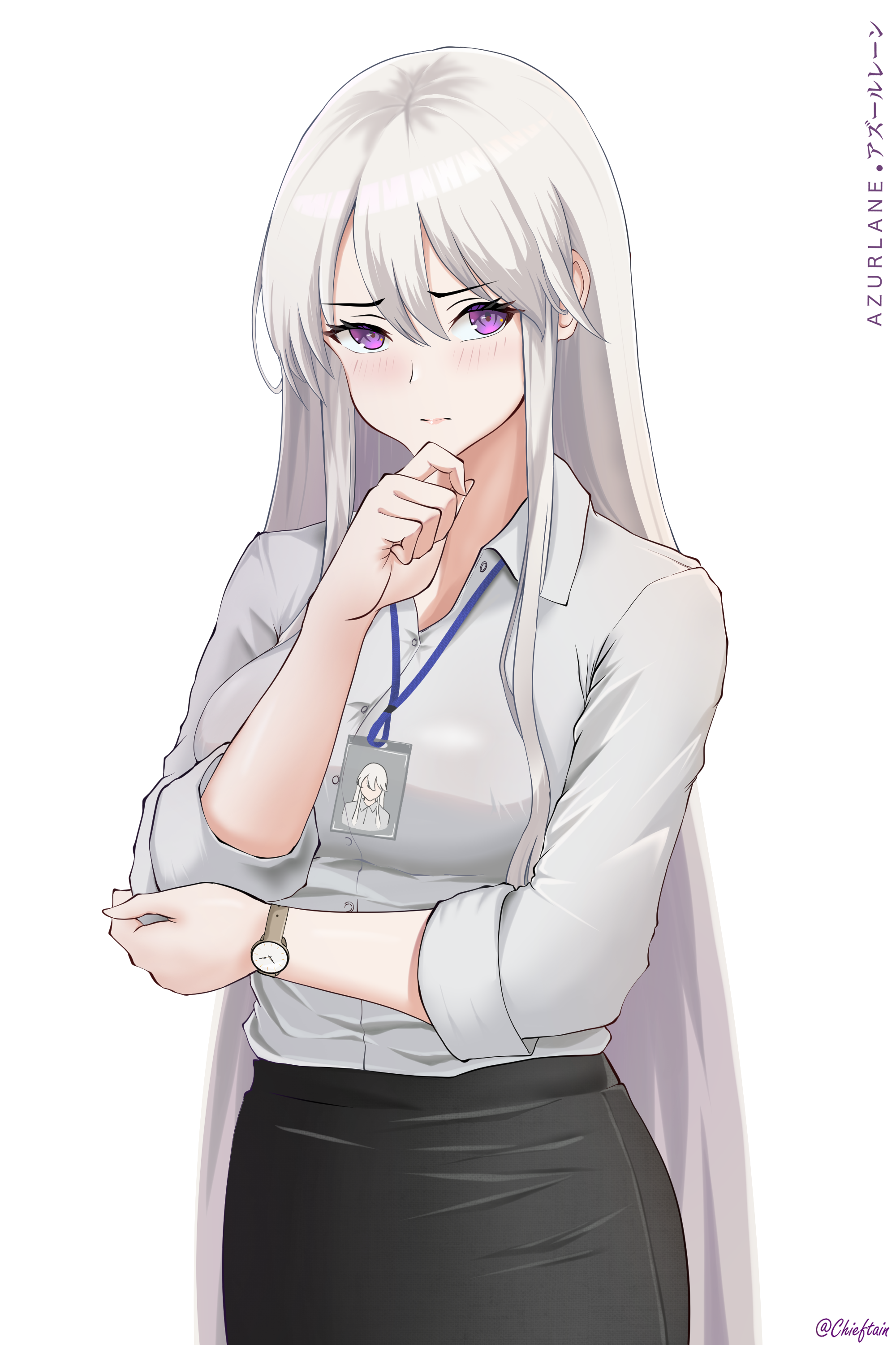 1girl absurdres alternate_costume artist_name azur_lane breasts chieftain_art13 closed_mouth collared_shirt cowboy_shot dress_shirt english_text enterprise_(azur_lane) finger_to_own_chin formal_clothes hand_on_own_chin highres id_card lanyard large_breasts long_hair office_lady pencil_skirt purple_eyes shirt shirt_tucked_in sidelocks simple_background skirt sleeves_rolled_up solo thinking very_long_hair watch white_background white_hair white_shirt