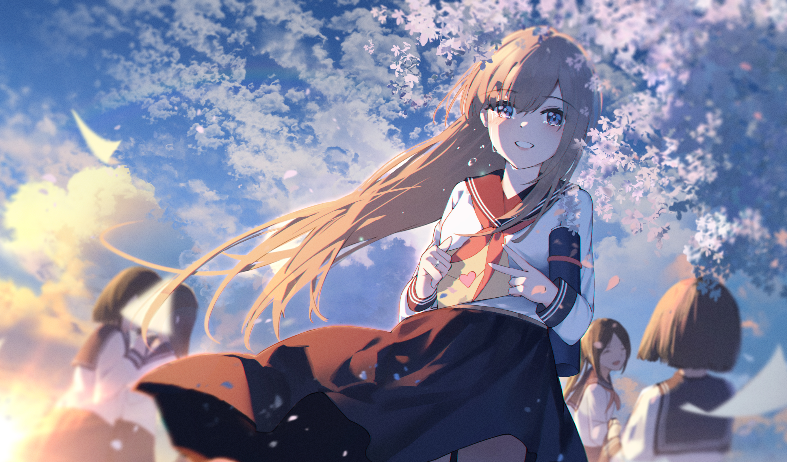 5girls black_sailor_collar black_skirt blue_eyes blue_sky blurry_edges blush brown_hair cherry_blossoms clenched_hand commentary_request cowboy_shot crying crying_with_eyes_open diploma_tube dutch_angle evening falling_petals floating_clothes floating_hair flying_paper graduation grin hair_over_shoulder highres jewelry letter long_hair long_sidelocks long_skirt long_sleeves love_letter multiple_girls neckerchief orange_clouds original paper parted_bangs petals red_lips red_neckerchief ring sailor_collar shirt sidelocks skirt sky smile solo_focus standing straight_hair streaming_tears sun sunset tears v very_long_hair white_shirt wvmao