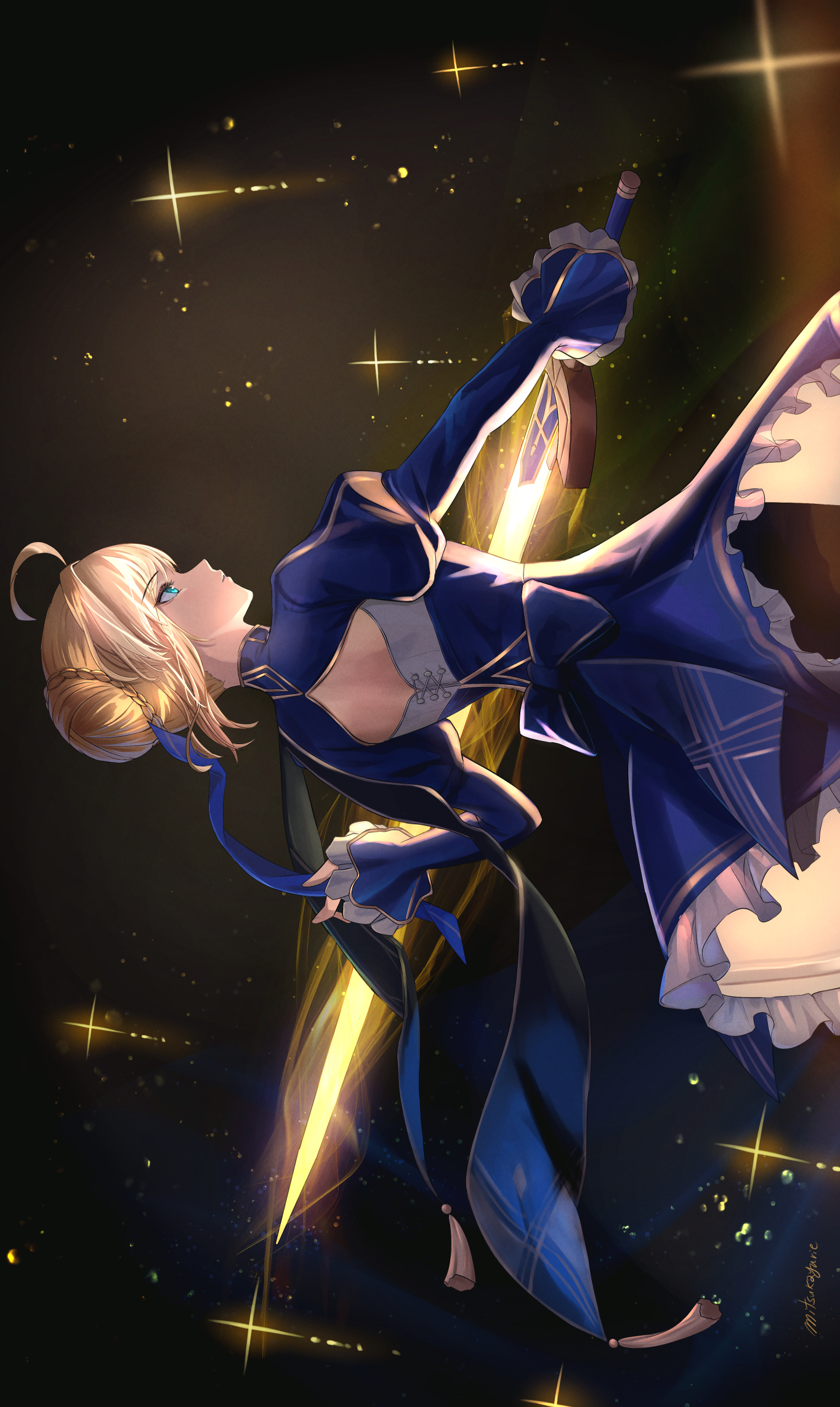 1girl ahoge artist_name artoria_pendragon_(fate) back_cutout blonde_hair blue_dress clothing_cutout commentary_request cowboy_shot dress excalibur_(fate/stay_night) fate/stay_night fate_(series) from_side glowing glowing_sword glowing_weapon green_eyes hair_bun highres holding holding_sword holding_weapon honkai:_star_rail honkai_(series) juliet_sleeves long_sleeves mitsukayurie pantyhose puffy_sleeves saber_(fate) sidelocks sideways solo sword weapon