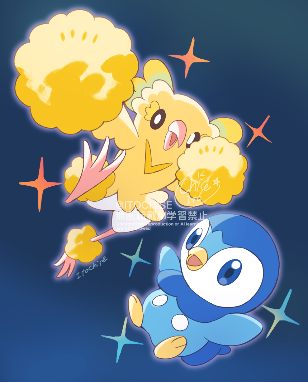 bird blue_eyes bright_pupils commentary_request gen_4_pokemon gen_7_pokemon highres nintendo no_humans open_mouth orange_(orangelv20) oricorio piplup pokemon pokemon_(creature) pokemon_focus signature sparkle watermark white_pupils