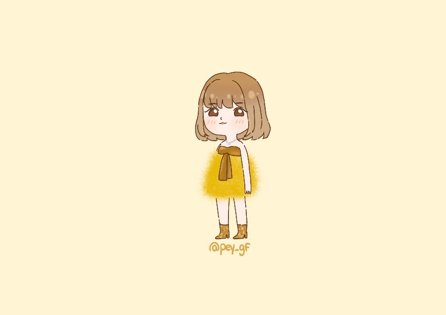 1girl bare_shoulders blunt_bangs boots brown_eyes brown_hair chibi chibi_only closed_mouth commentary dress english_commentary eunha_(gfriend) gfriend k-pop pey_gf real_life simple_background solo twitter_username yellow_background yellow_dress