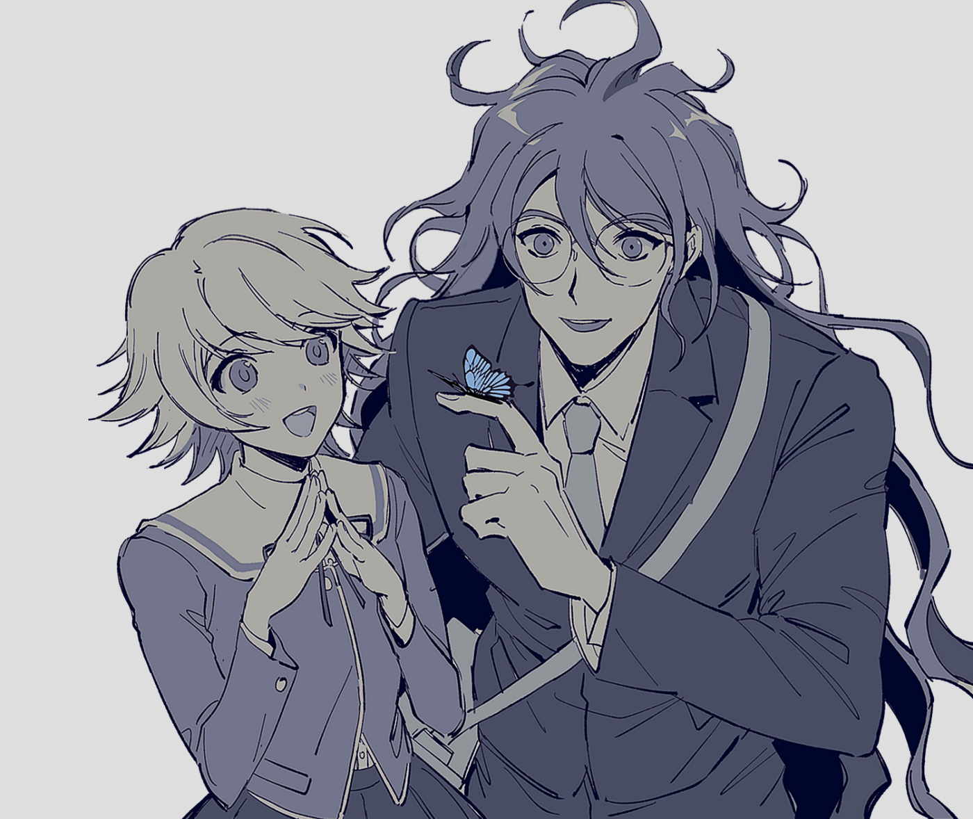 2boys :d blush bug butterfly collared_shirt crossdressing crossdressing_(mtf) danganronpa:_trigger_happy_havoc danganronpa_(series) danganronpa_v3:_killing_harmony fujisaki_chihiro glasses gokuhara_gonta insect jacket long_hair long_sleeves male_focus messy_hair multiple_boys neck_ribbon necktie open_mouth own_hands_together pants ribbon round_eyewear shirt skirt smile sophie_(693432) trap