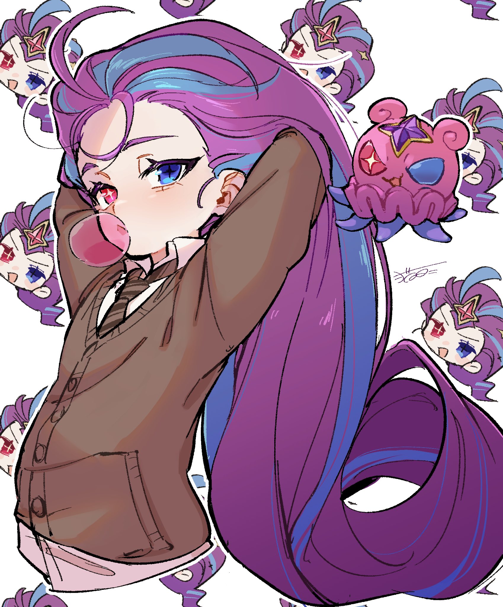 1girl ahoge alternate_costume arms_up blowing_bubble_gum blue_eyes blue_hair brown_jacket brown_necktie chewing_gum collared_shirt heterochromia highres jacket league_of_legends little_legend long_hair multicolored_hair multiple_views necktie neko-me-kun pink_eyes pink_hair purple_hair shirt smile star_guardian_zoe striped_clothes striped_necktie white_shirt zoe_(league_of_legends)