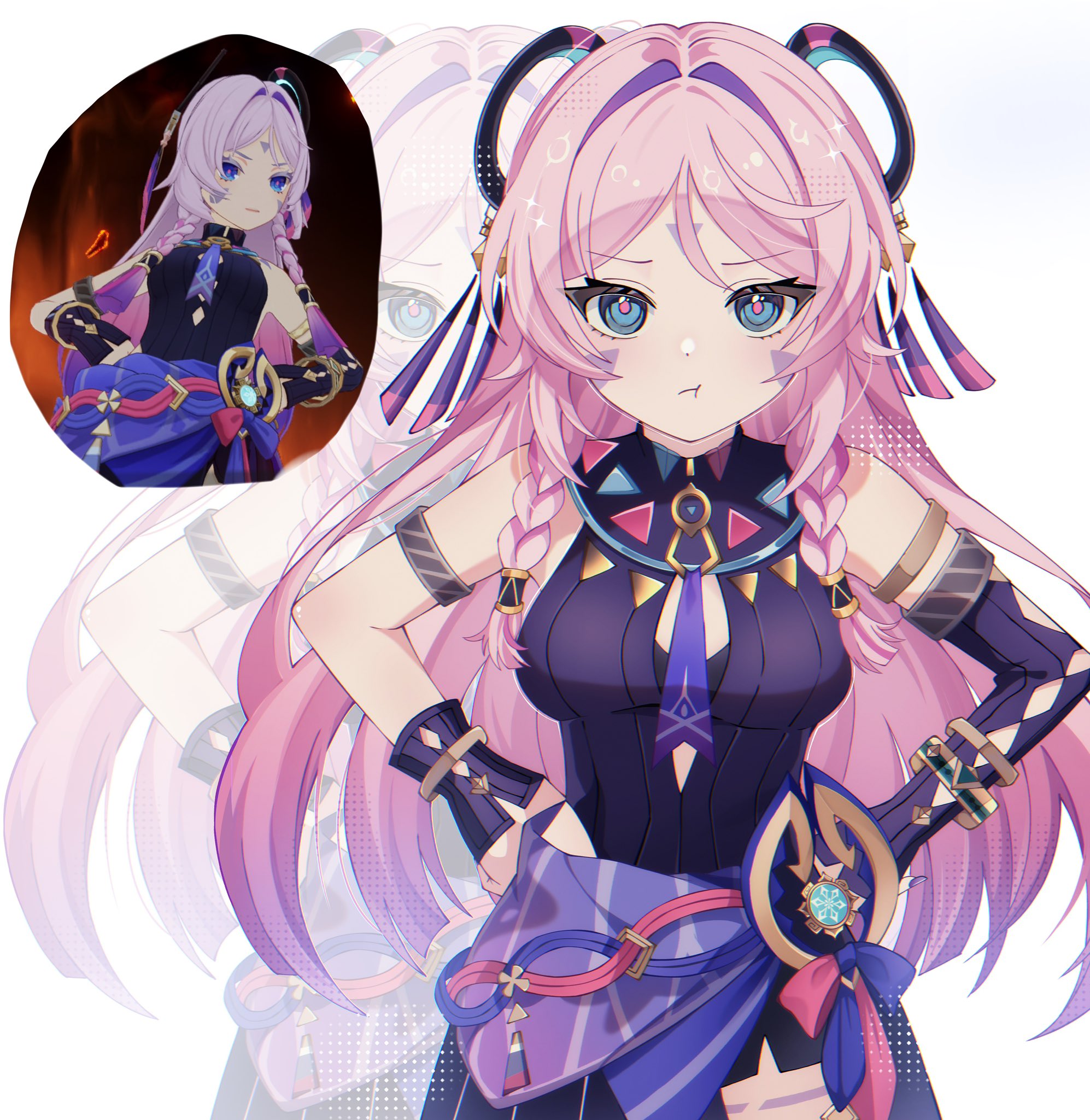 1girl :t armlet asymmetrical_gloves bare_shoulders blue_eyes braid breasts citlali_(genshin_impact) cowboy_shot cryo_symbol_(genshin_impact) elbow_gloves facial_mark floating_headgear forehead_mark game_screenshot_inset genshin_impact gloves gradient_hair hair_intakes hands_on_own_hips hashtag-only_commentary headgear highres jewelry leotard long_hair looking_at_viewer medium_breasts multicolored_hair pink_hair pink_pupils pout single_elbow_glove solo triangle triangle_facial_mark twin_braids vision_(genshin_impact) white_background woolly_(ll_0o0) zoom_layer