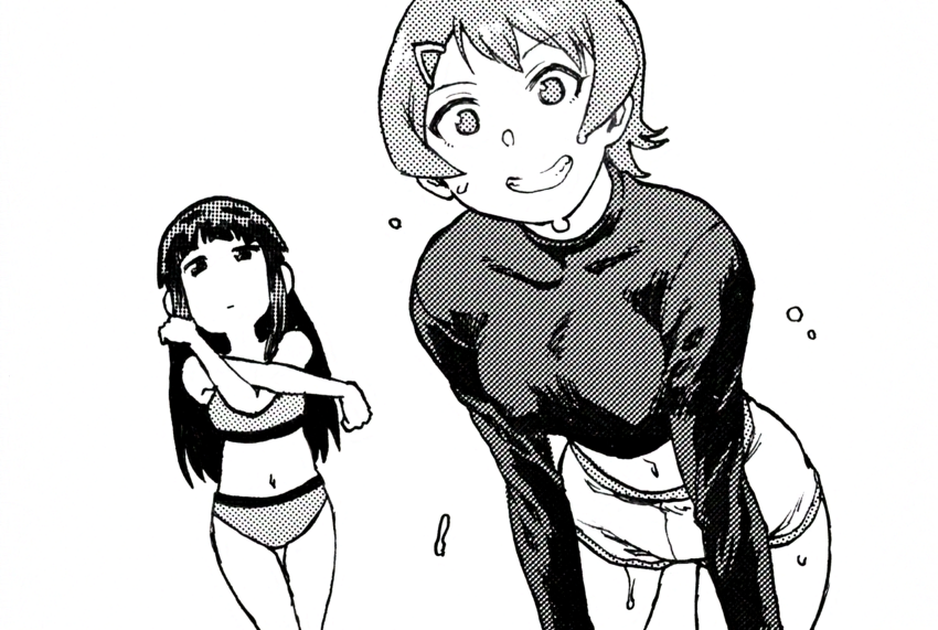 2girls black_hair blunt_bangs breasts closed_mouth crop_top hair_ornament large_breasts leaning_forward legs long_hair long_sleeves looking_at_viewer monochrome multiple_girls navel original pants short_hair smile standing stomach teeth thigh_gap thighs tsukudani_(coke-buta) turtleneck wet