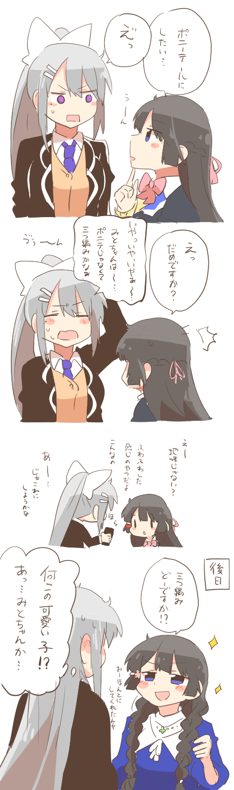 2girls :d ^^^ arm_behind_head arm_up black_hair black_jacket blazer bow braid brown_cardigan cardigan chibi collared_shirt grey_hair hair_between_eyes hair_bow hair_over_shoulder hair_ribbon highres higuchi_kaede higuchi_kaede_(1st_costume) higuchi_kaede_(casual) jacket long_hair low_twintails multiple_girls necktie nijisanji open_clothes open_jacket open_mouth pink_bow pink_ribbon ponytail purple_eyes purple_necktie rebecca_(keinelove) ribbon school_uniform shirt smile sparkle translation_request tsukino_mito tsukino_mito_(1st_costume) tsukino_mito_(casual) twin_braids twintails v-shaped_eyebrows very_long_hair virtual_youtuber white_bow white_shirt