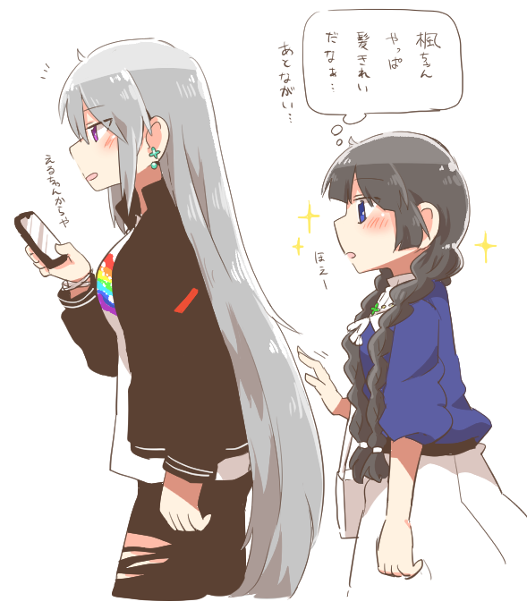 2girls bag black_hair black_jacket black_pants blue_eyes blue_shirt braid cellphone chibi grey_hair hair_over_shoulder higuchi_kaede higuchi_kaede_(casual) holding holding_phone jacket long_sleeves low_twintails multiple_girls nijisanji open_clothes open_jacket pants phone pleated_skirt profile puffy_short_sleeves puffy_sleeves purple_eyes rebecca_(keinelove) shirt short_sleeves shoulder_bag simple_background skirt torn_clothes torn_pants translation_request tsukino_mito tsukino_mito_(casual) twin_braids twintails virtual_youtuber white_background white_shirt white_skirt