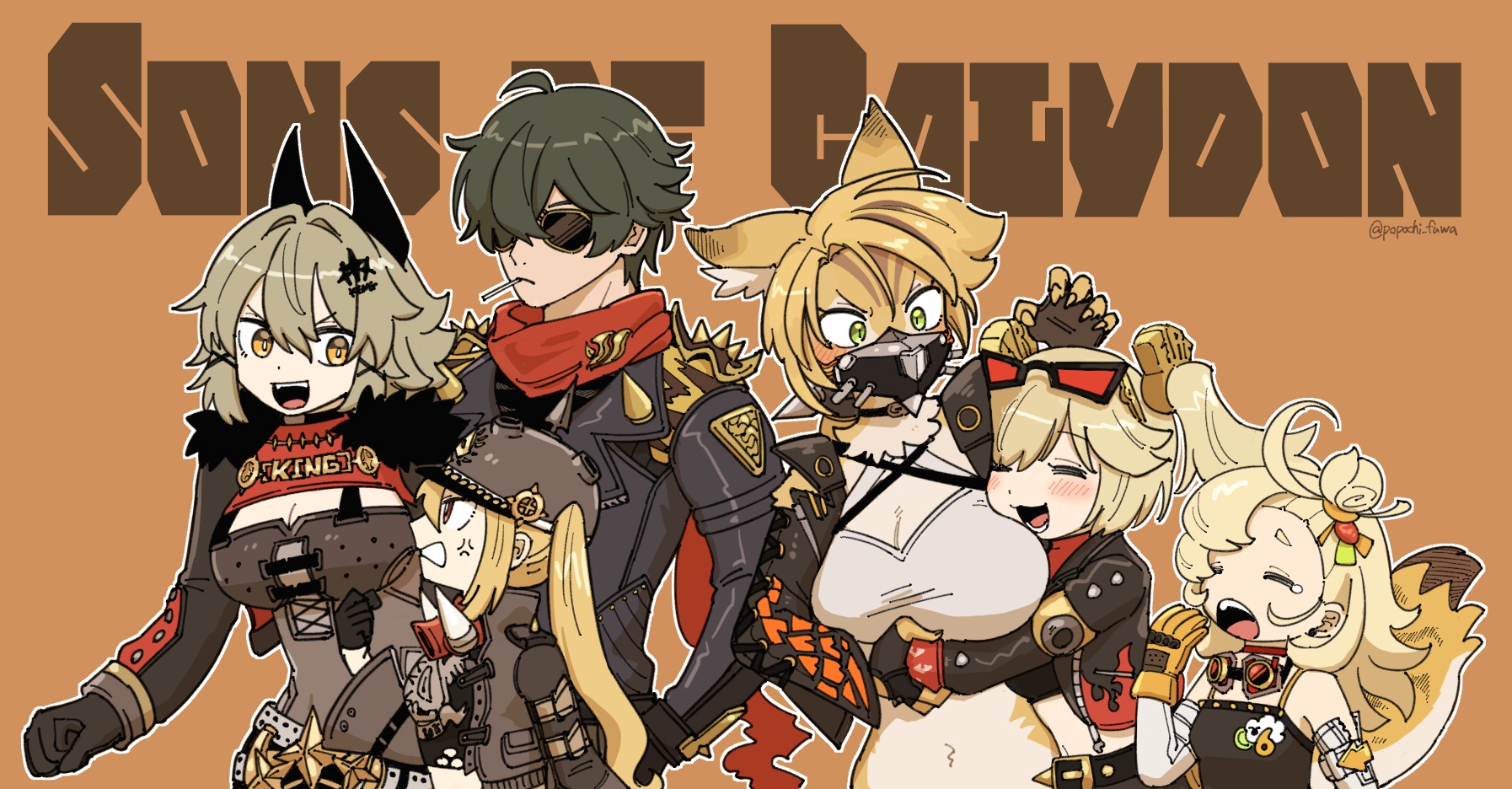 1boy 5girls anger_vein animal_ears black_hair black_jacket blonde_hair breasts burnice_white caesar_king_(zenless_zone_zero) closed_eyes closed_mouth commentary crop_top english_text eyewear_on_head furry furry_female gloves goggles goggles_around_neck green_eyes grey_hair hair_between_eyes hair_ornament helmet highres hug jacket large_breasts lighter_(zenless_zone_zero) long_hair luciana_de_montefio mask mask_around_neck multiple_girls open_mouth piper_wheel popochi_fuwa pulchra_fellini red_scarf scarf shirt side_ponytail sons_of_calydon_(zenless_zone_zero) spiked_jacket sunglasses untranslatable_commentary tail torn_clothes torn_scarf twitter_username yawning zenless_zone_zero