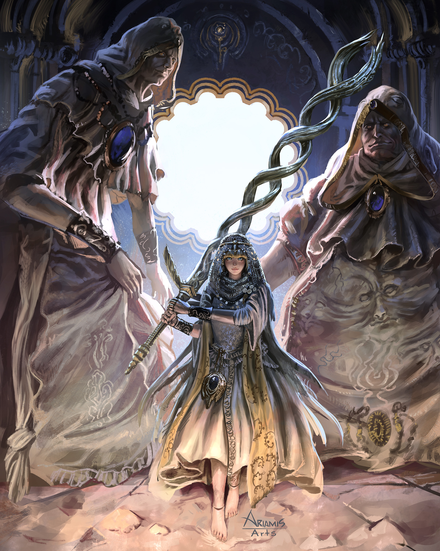 1girl 2boys ariamis_arts armor barefoot black_gem blonde_hair blue_eyes blunt_bangs bracer capelet chainmail cowl doll_joints dress elden_ring elden_ring_nightreign feet frilled_dress frills full_body gem godskin_apostle godskin_noble godslayer's_greatsword_(elden_ring) gold_trim highres huge_weapon jewelry joints looking_at_viewer multiple_boys official_alternate_costume ornate_clothes purple_gem revenant_(elden_ring) signature slit_pupils standing sword two-handed_sword weapon white_dress wide_sleeves yellow_eyes