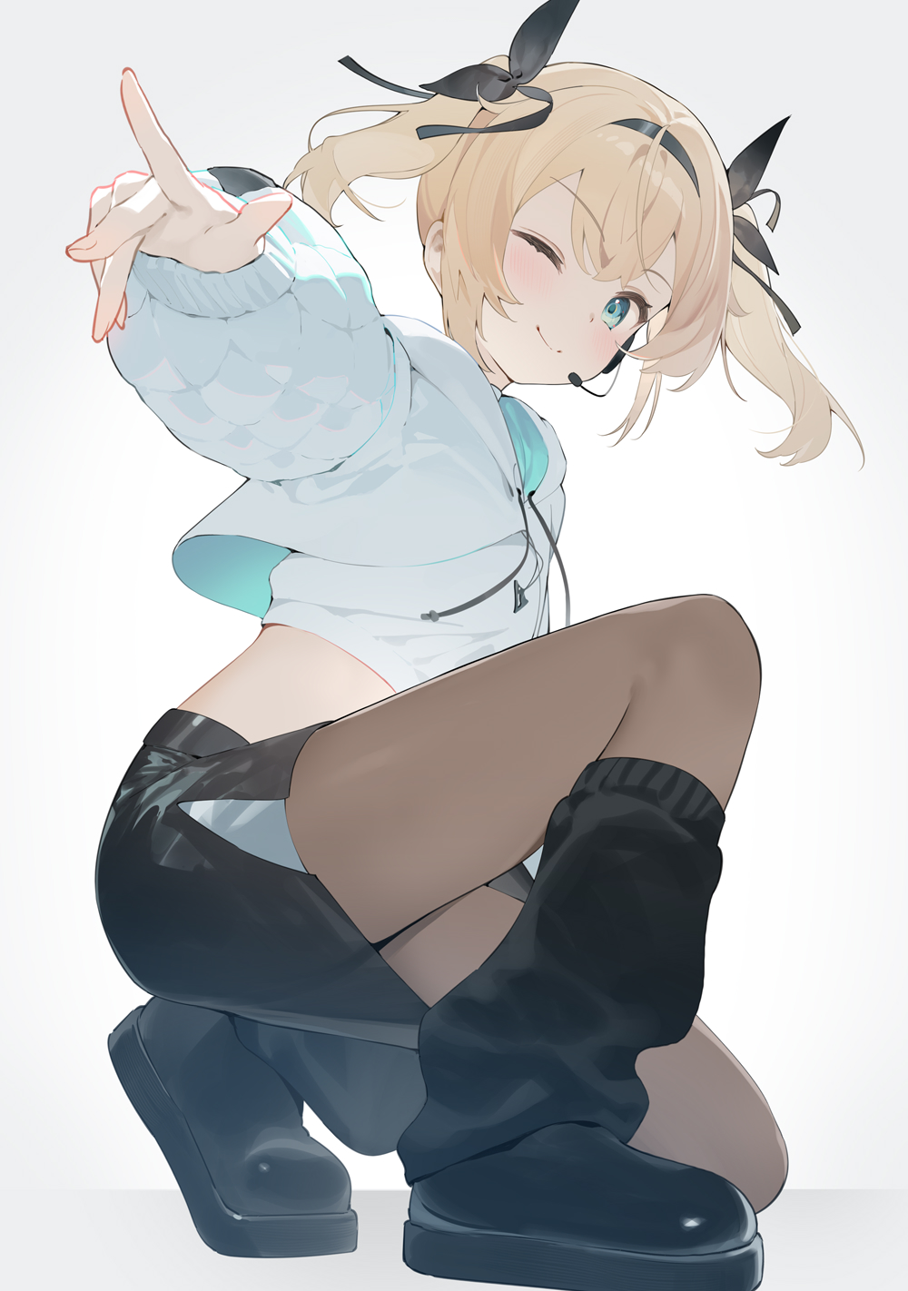 1girl aqua_eyes black_shoes black_skirt black_socks blonde_hair blush brown_pantyhose closed_mouth commentary_request crop_top cropped_hoodie full_body hair_ribbon hana_mori headset highres hololive hood hood_down hoodie jewelry kazama_iroha kazama_iroha_(pop_dance) long_hair long_sleeves looking_at_viewer midriff miniskirt necklace official_alternate_costume on_one_knee one_eye_closed pantyhose puffy_long_sleeves puffy_sleeves ribbon shirt shoes simple_background skirt sleeves_past_wrists smile socks solo twintails undershirt virtual_youtuber white_background white_hoodie white_shirt