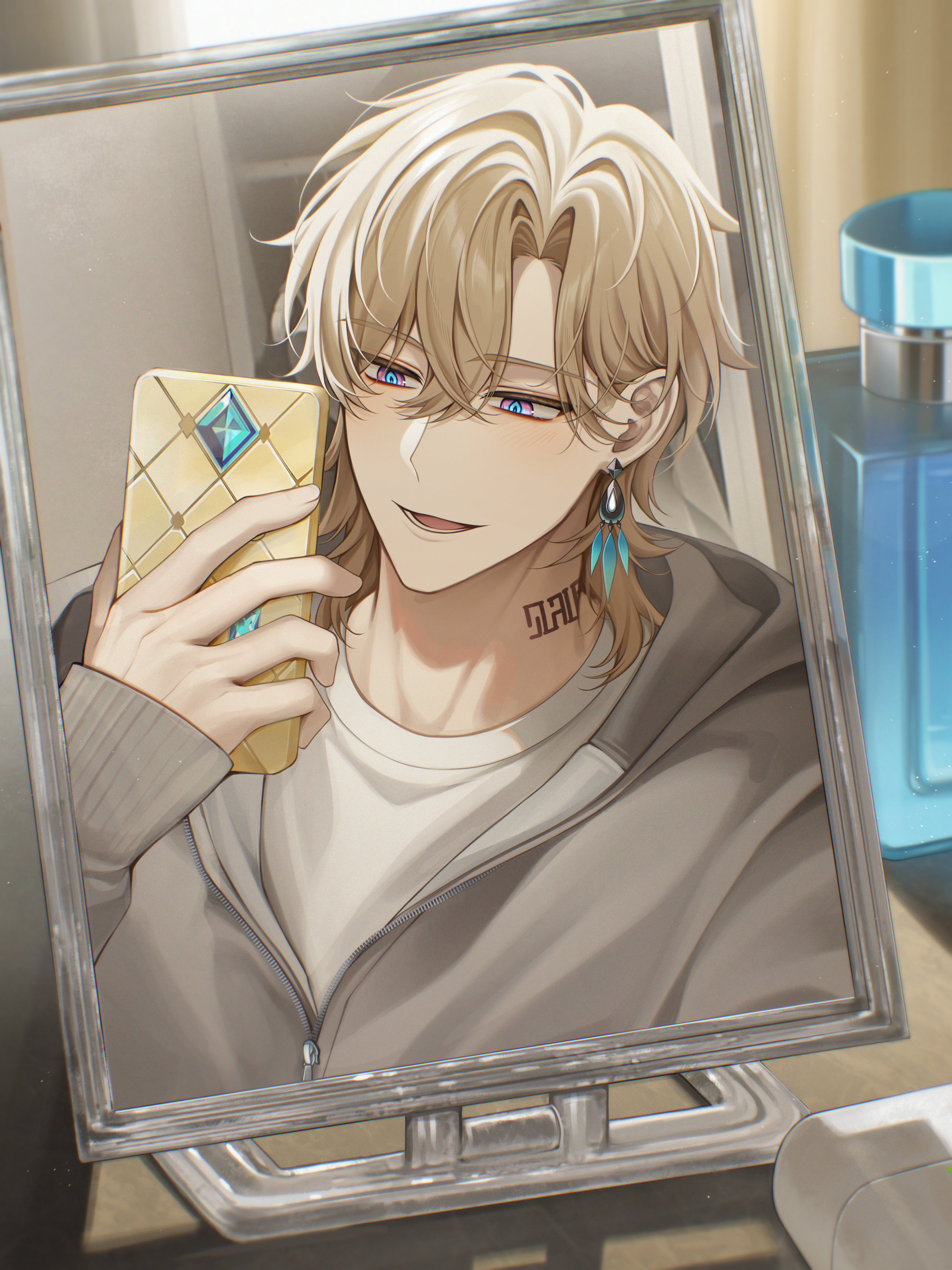 1boy absurdres aventurine_(honkai:_star_rail) blonde_hair blue_eyes cellphone earrings grey_hood hair_between_eyes highres holding holding_phone honkai:_star_rail honkai_(series) hood hooded_jacket jacket jewelry long_hair male_focus mirror mirror_selfie multicolored_eyes neck_tattoo open_mouth phone pink_eyes selfie shirt smartphone smile solcha solo tattoo white_shirt