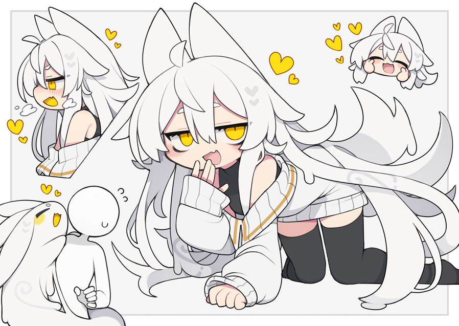 1girl 1other ahoge black_shirt black_thighhighs cardigan chibi chibi_inset colored_tongue commentary_request dorodra_(kisaragi_kaya) fang flipped_hair flying_sweatdrops hair_between_eyes hair_flaps half-closed_eyes hand_to_own_mouth hand_up heart hug kisaragi_kaya long_hair long_sleeves multiple_views no_shoes open_mouth original shirt sidelocks skin_fang sleeveless sleeveless_shirt sleeves_past_wrists smile smug thighhighs turtleneck turtleneck_shirt very_long_hair white_cardigan white_hair yellow_eyes yellow_tongue