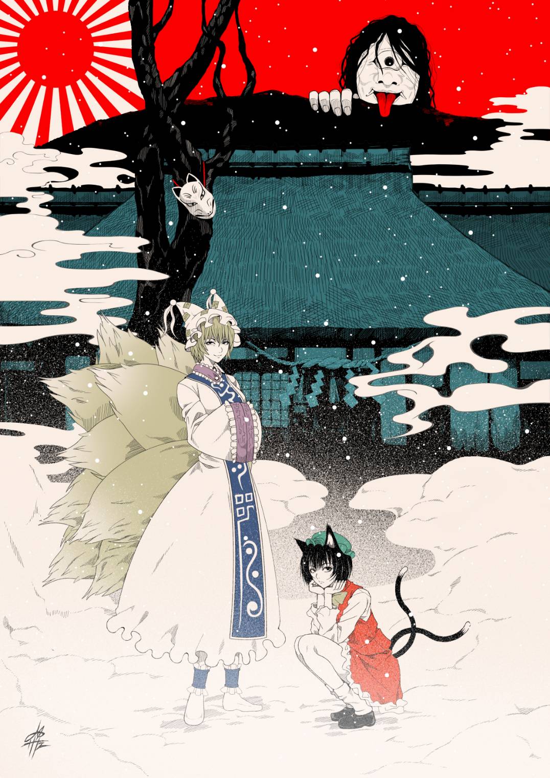 animal_ear_piercing animal_ears animal_hat black_hair blonde_hair blue_tabard cat_ears cat_tail chen cyclops dress fine_art_parody fog fox_ears fox_mask fox_tail frilled_dress frilled_socks frills green_hat hand_on_own_chin hands_in_opposite_sleeves hat highres kitsune long_sleeves looking_at_viewer mask mob_cap multiple_tails nekomata nihonga one-eyed outdoors parody red_dress red_sky rope shide shimenawa short_hair signature sky socks squatting standing sunburst tabard tail touhou traditional_youkai tree two_tails ukiyo-e white_dress white_socks yakumo_ran yamada_satoshi