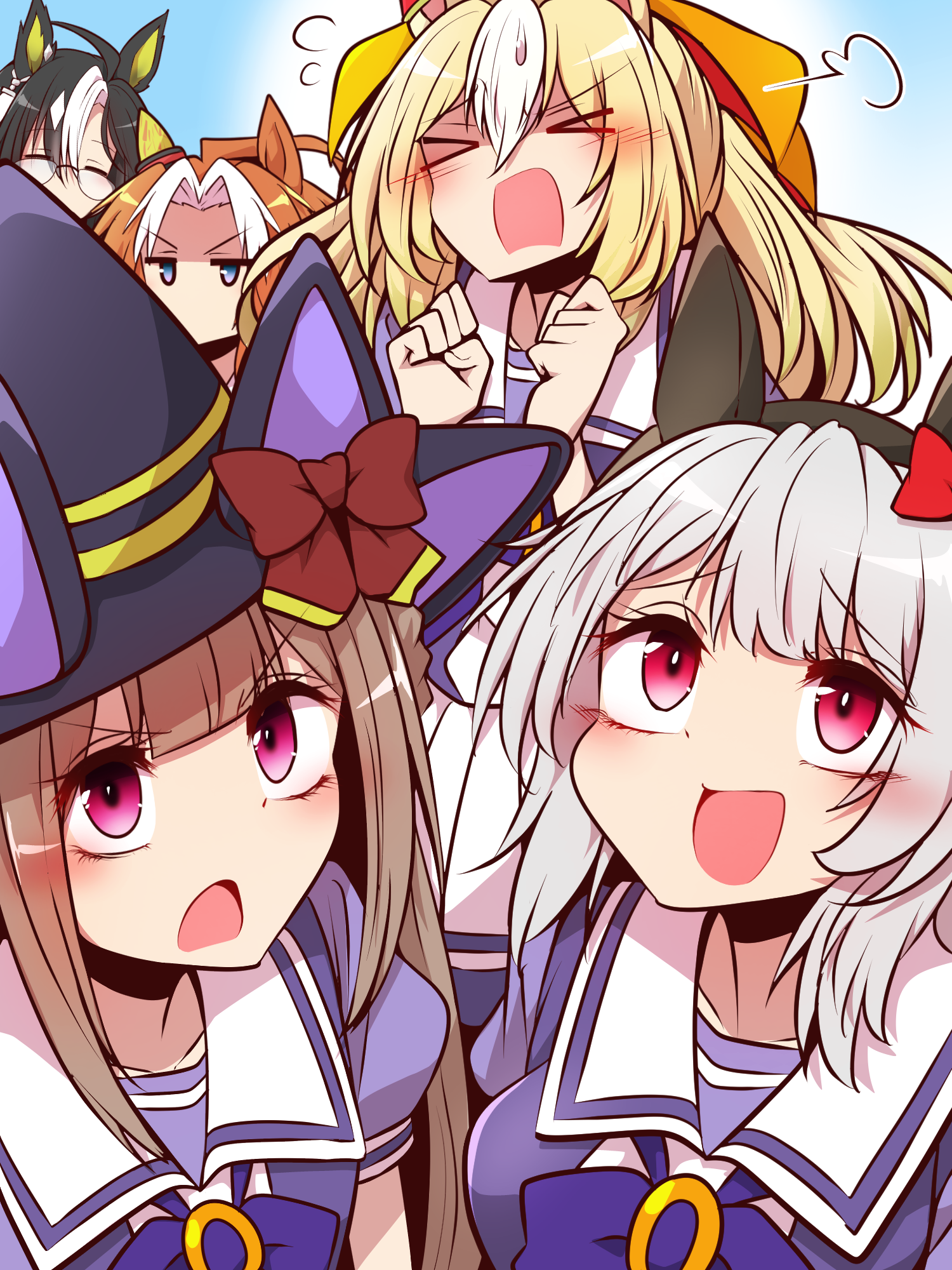 >_< 5girls ahoge animal_ear_headwear black_hair black_hairband blonde_hair blue_eyes blunt_bangs bow bowtie braid braided_hair_rings bright_pupils clenched_hands closed_eyes commentary_request curren_chan_(umamusume) dream_journey_(umamusume) durandal_(umamusume) ear_bow ear_covers ear_ornament fake_animal_ears flying_sweatdrops from_above glasses grey_hair hair_between_eyes hair_intakes hair_rings hairband hat hat_bow hat_ribbon highres huge_ahoge jealous long_hair looking_at_viewer looking_up medium_hair multicolored_hair multiple_girls orange_hair orfevre_(umamusume) puff_of_air puffy_short_sleeves puffy_sleeves purple_bow purple_bowtie purple_eyes purple_hat purple_shirt red_bow red_eyes ribbon sailor_collar school_uniform shirt short_sleeves sidelocks single_ear_cover single_hair_intake summer_uniform sweatdrop sweep_tosho_(umamusume) tracen_school_uniform two-sided_fabric two-tone_hair umamusume v-shaped_eyebrows white_hair white_sailor_collar witch_hat yonedatomo_mizu