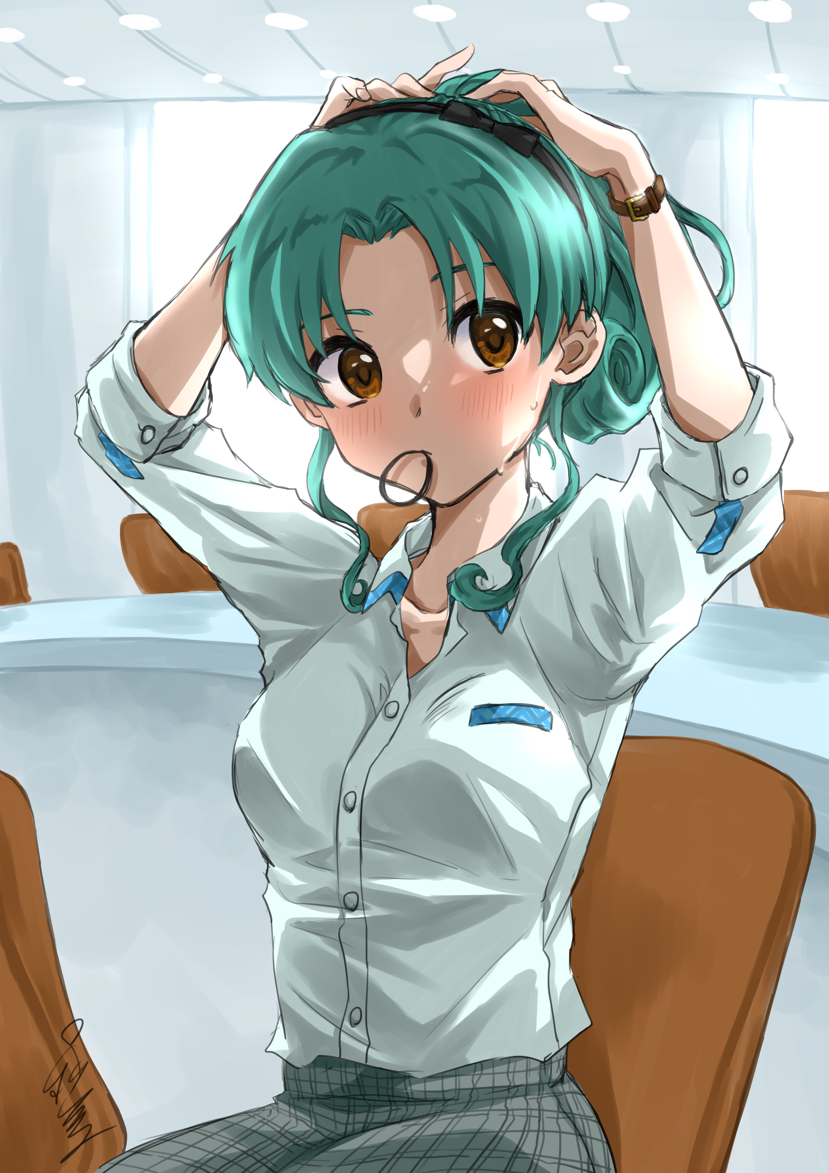 1girl absurdres arms_up black_hairband breasts brown_eyes chair collared_shirt green_hair grey_skirt hair_tie_in_mouth hairband highres idolmaster idolmaster_million_live! idolmaster_million_live!_theater_days indoors looking_to_the_side mouth_hold on_chair open_collar plaid_clothes plaid_skirt ponytail shirt signature sitting skirt solo summer_college_(idolmaster) sweat tokugawa_matsuri toshiki74_p tying_hair white_shirt