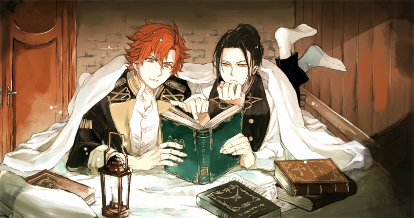 2boys black_jacket black_pants black_vest book brown_eyes closed_mouth collared_jacket collared_shirt commentary_request curtained_hair felix_hugo_fraldarius fingernails fire_emblem fire_emblem:_three_houses frown garreg_mach_monastery_uniform hair_bun hand_on_own_chin head_rest holding holding_book jacket lantern long_sleeves lying male_focus multiple_boys nintendo on_stomach open_book open_clothes open_collar open_jacket orange_eyes pants parted_lips pointing popped_collar reading school_uniform shirt single_hair_bun socks stone_wall sylvain_jose_gautier tsugarot under_covers vest white_shirt white_socks