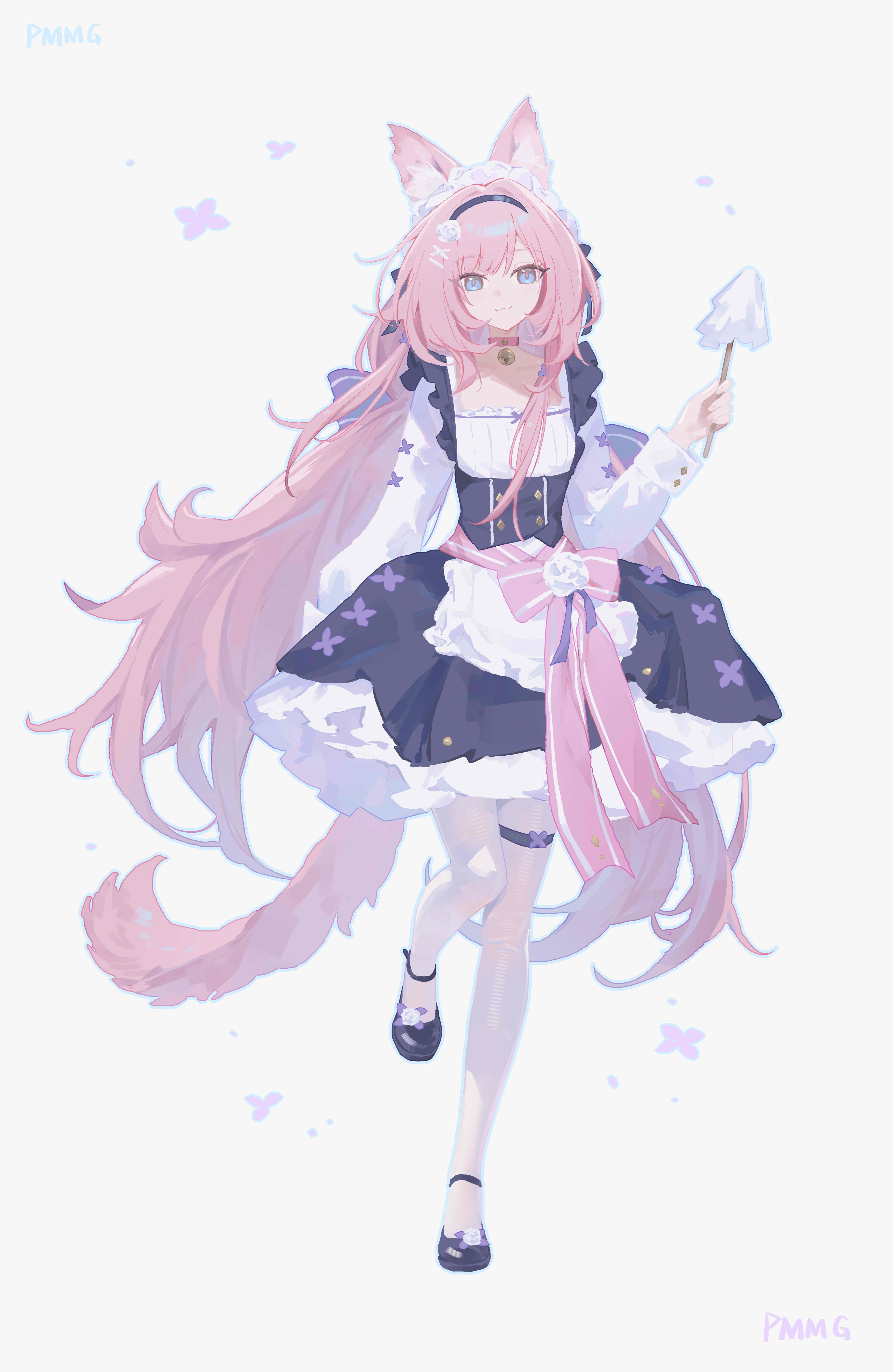 1girl :3 absurdres alternate_costume animal_ear_fluff apron artist_name black_dress black_shoes blue_eyes breasts buttons closed_mouth double-breasted dress elysia_(honkai_impact) full_body grey_background highres holding honkai_(series) honkai_impact_3rd long_hair long_sleeves looking_at_viewer missing_commentary pantyhose pink_hair pink_tail pmmg shoes simple_background small_breasts smile solo tail thigh_strap very_long_hair waist_apron white_pantyhose