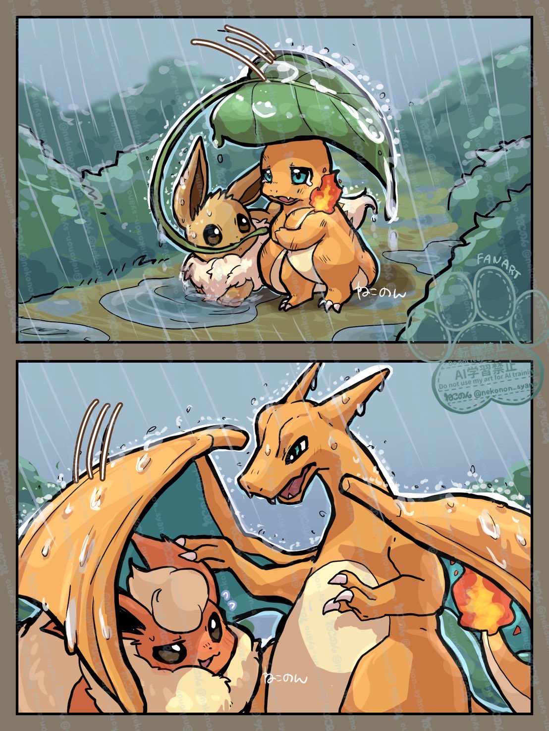 blue_eyes charizard charmander claws eevee fangs fire flame-tipped_tail flareon gen_1_pokemon highres leaf nekonon nintendo no_humans open_mouth pokemon pokemon_(creature) pokemon_focus puddle rain tail water_drop wet wings