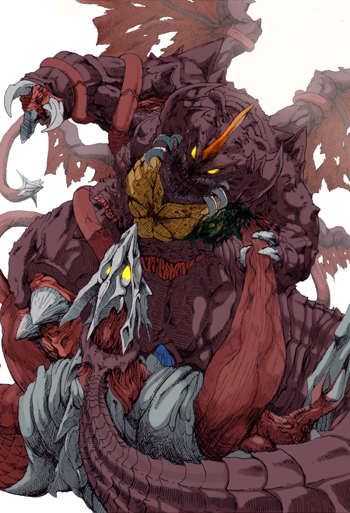 arm_blade bleeding blood claws colored_blood crest crossover daiei_film destoroyah gamera_(series) gamera_3:_revenge_of_iris giant giant_monster glowing glowing_eyes godzilla_(series) godzilla_vs._destoroyah green_blood horns injury iris_(gamera) kaiju monster muscular_arms muscular_legs no_humans open_mouth pincers semania9ja sharp_teeth simple_background single_horn stab tail teeth tentacles thick_thighs thighs toho torn_wings tusks veins veiny_tentacles weapon white_background wings yellow_eyes