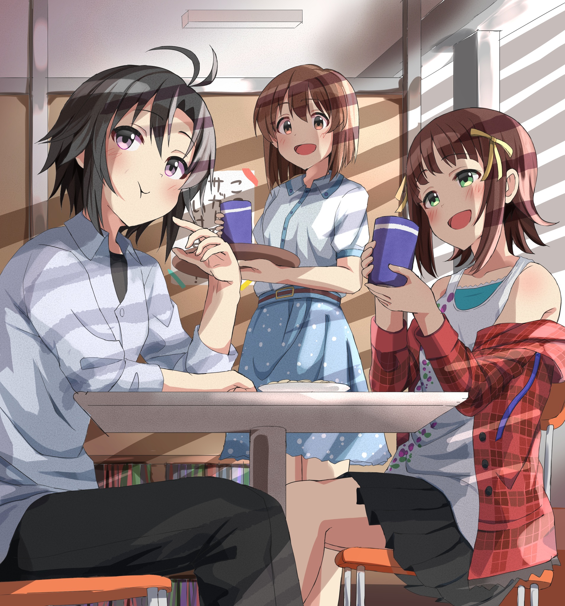 3girls amami_haruka antenna_hair arms_on_table black_hair black_pants black_skirt blue_skirt blush brown_eyes brown_hair chair closed_mouth collared_shirt cup day green_eyes hagiwara_yukiho hair_ribbon haruki_(haruki678) highres holding holding_cup holding_tray idolmaster idolmaster_(classic) indoors jacket kikuchi_makoto long_sleeves multiple_girls on_chair open_clothes open_jacket open_mouth pants plate purple_eyes red_jacket ribbon shirt short_hair short_sleeves sitting skirt smile standing table tank_top tray white_shirt white_tank_top window_shadow yellow_ribbon