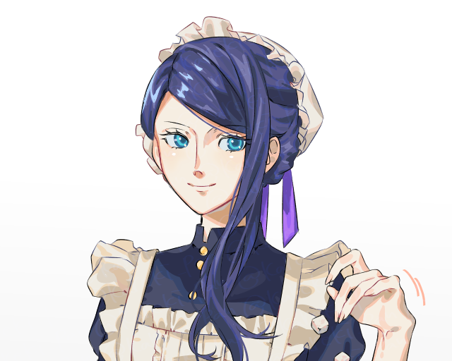 1girl apron blue_eyes blue_hair buttons commentary_request eyelashes gunjo_shizuko hat nico_robin one_piece single_sidelock smile solo swept_bangs twitter_username upper_body