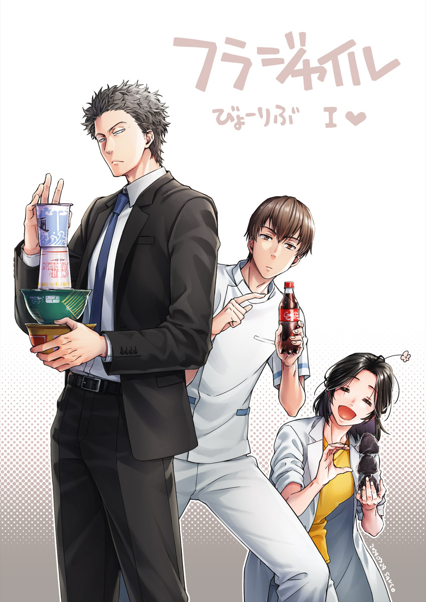 1girl 2boys artist_name belt black_pants black_suit blue_necktie bottle brown_eyes brown_hair closed_eyes coca-cola copyright_name instant_cup_noodles dated food formal_clothes fragile:_pathologist_kishi highres holding holding_food instant_cup_noodles instant_noodles kishi_keiichirou lab_coat light_frown medium_hair miyazaki_chihiro mori_hisashi_(fragile) multiple_boys necktie nishinomiya_sakuko onigiri pants pointing shirt short_hair soda_bottle suit white_pants yellow_shirt
