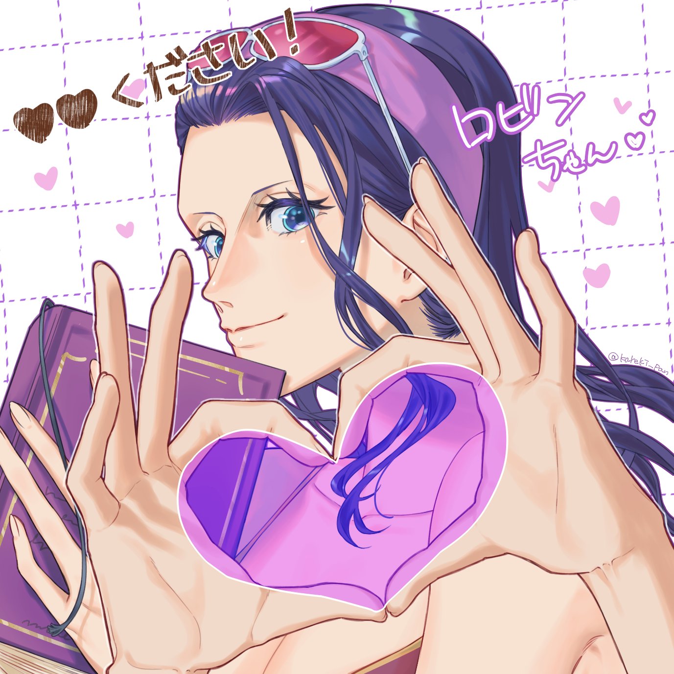 1girl blue_eyes book closed_mouth devil_fruit_power extra_arms eyelashes eyewear_on_head gunjo_shizuko hana_hana_no_mi headband heart heart_hands highres long_hair nico_robin one_piece purple_headband smile solo twitter_username upper_body