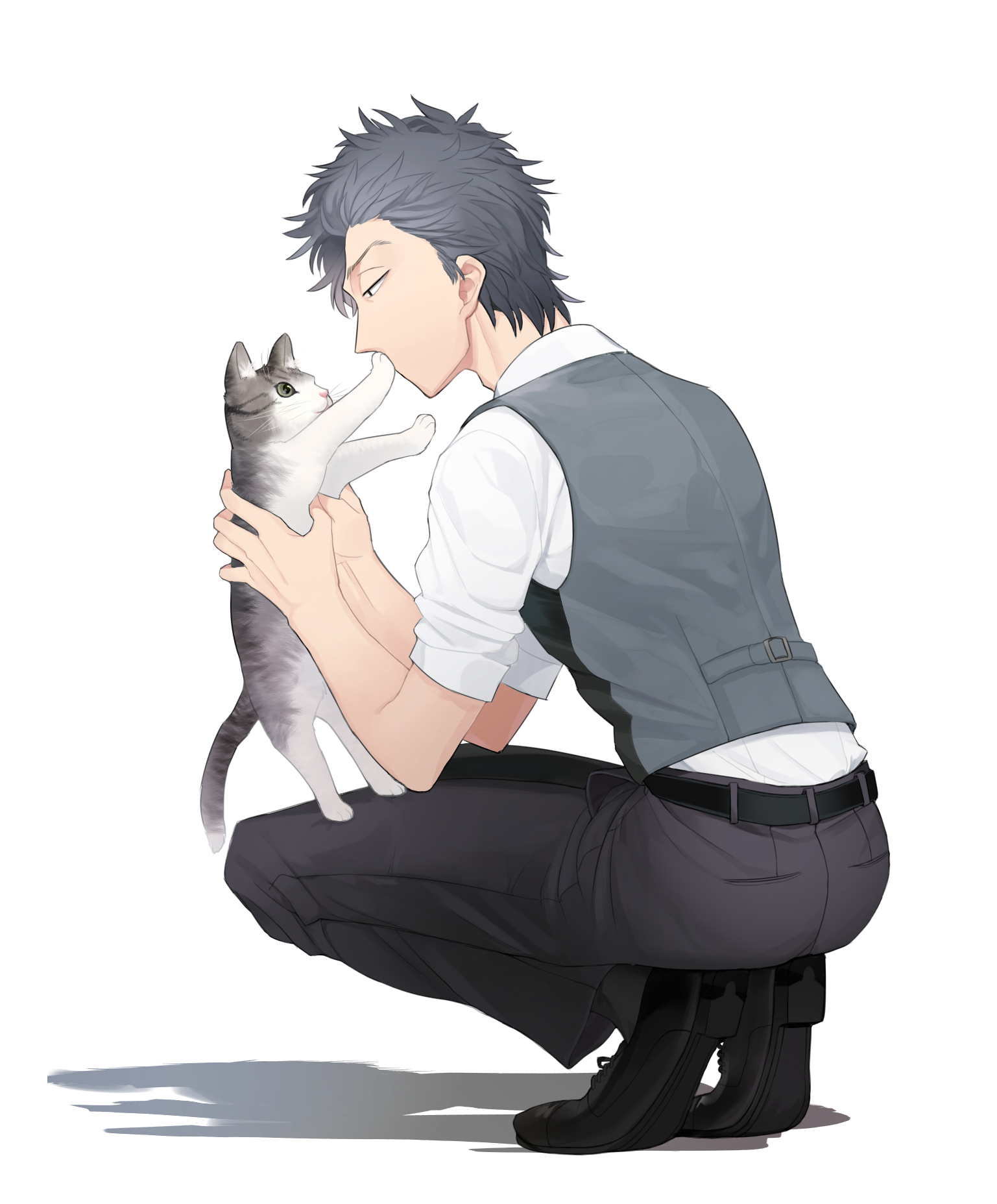 1boy animal belt black_pants black_shoes cat eye_contact fragile:_pathologist_kishi grey_hair grey_vest highres holding holding_animal holding_cat kishi_keiichirou looking_at_another pants rotten_tofu shadow shirt shoes simple_background solo vest white_background white_shirt