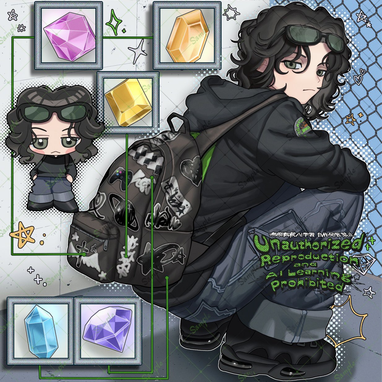 backpack bag black_hair black_hoodie blush chibi denim eyewear_on_head gem heart highres hood hoodie jeans jitome original pale_skin pants poin_(goruchopame) shoes star_(symbol) sunglasses
