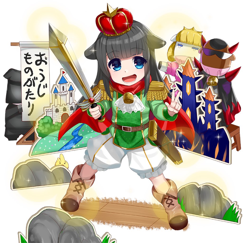 1girl black_hair blue_eyes boots brown_boots cow_girl cow_horns crown epaulettes green_shirt holding holding_sword holding_weapon horns kusaka_souji long_hair mini_crown miru_holstein open_mouth shirt shorts sword uchi_no_hime-sama_ga_ichiban_kawaii weapon white_shorts