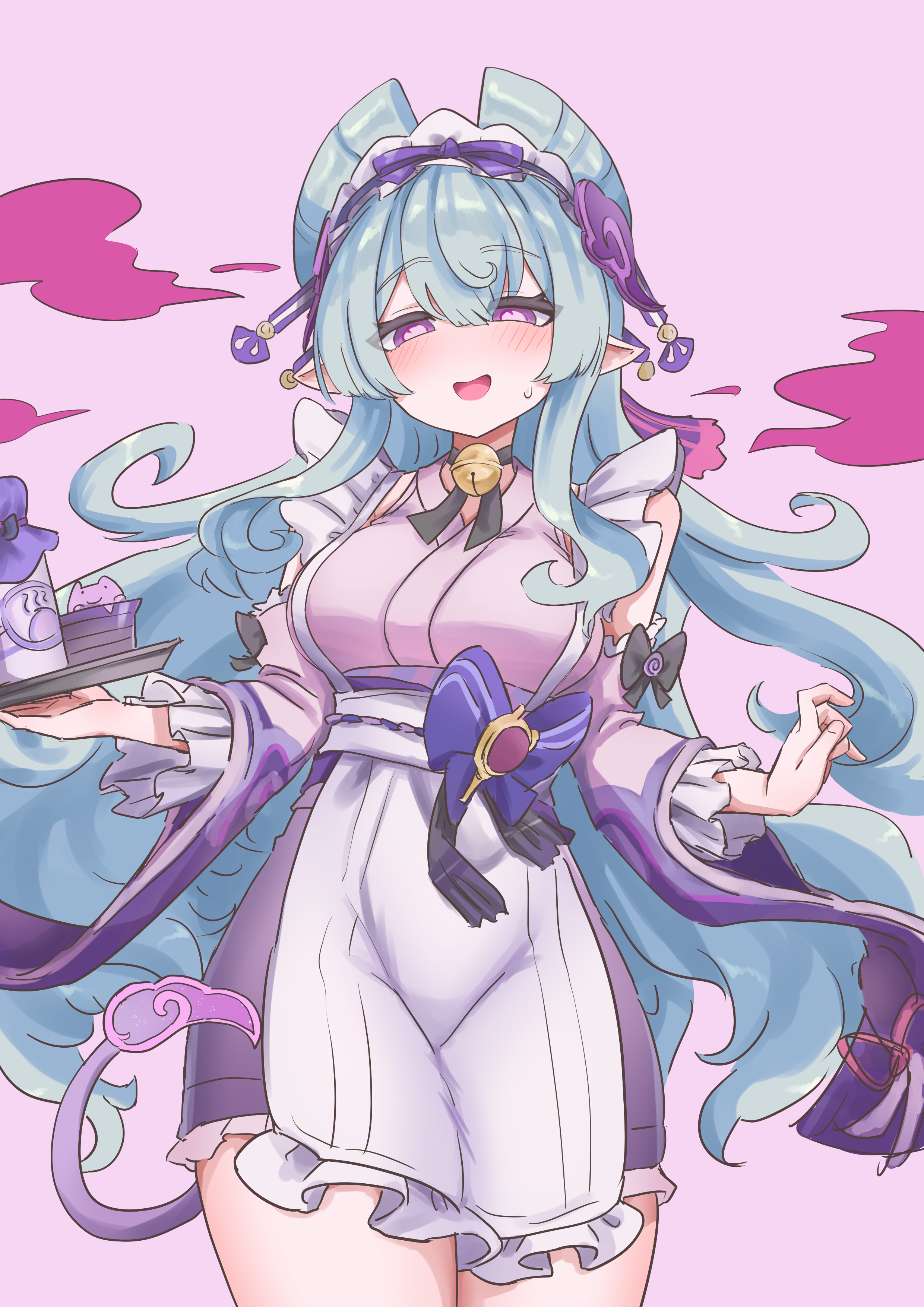 1girl :d absurdres bell blue_hair breasts commentary_request cowboy_shot detached_sleeves frilled_hairband frills genshin_impact hairband highres holding holding_tray japanese_clothes kimono long_hair looking_at_viewer neck_bell nihongami open_mouth pink_background pink_kimono pointy_ears purple_eyes purple_sleeves simple_background smile solo standing sweatdrop sy_(syy_gv) tail tray yumemizuki_mizuki