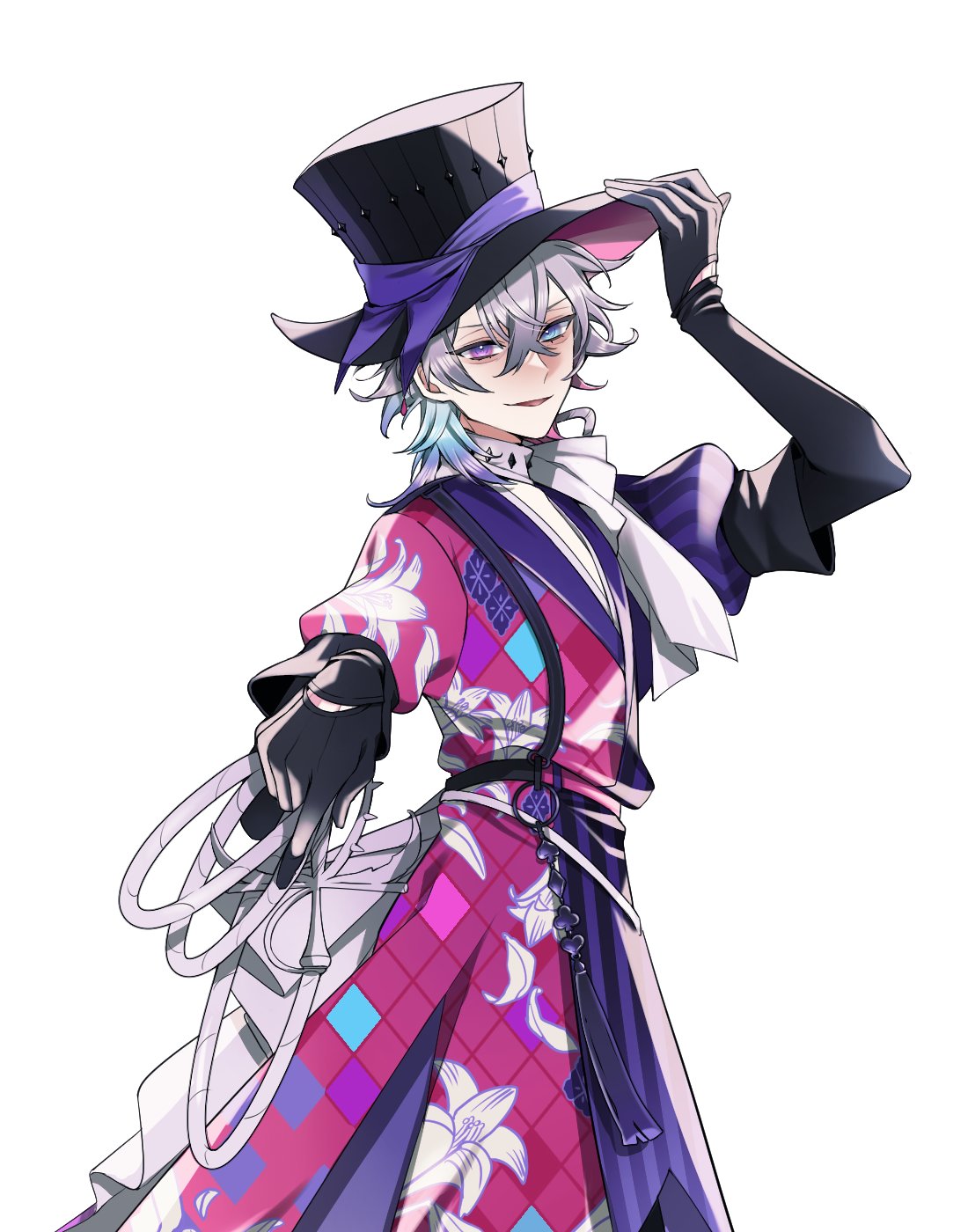 029jrr 1boy adjusting_clothes adjusting_headwear bishounen black_gloves blue_eyes blue_hair coat floral_print foreshortening from_side gavis_bettel gavis_bettel_(1st_costume) gloves grey_hair hair_between_eyes hand_up hat heterochromia highres holding holding_whip holostars holostars_english lily_print long_sleeves looking_at_viewer male_focus medium_hair multicolored_coat multicolored_hair pink_eyes pink_hair scarf smile solo top_hat upper_body virtual_youtuber white_background white_scarf